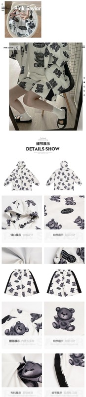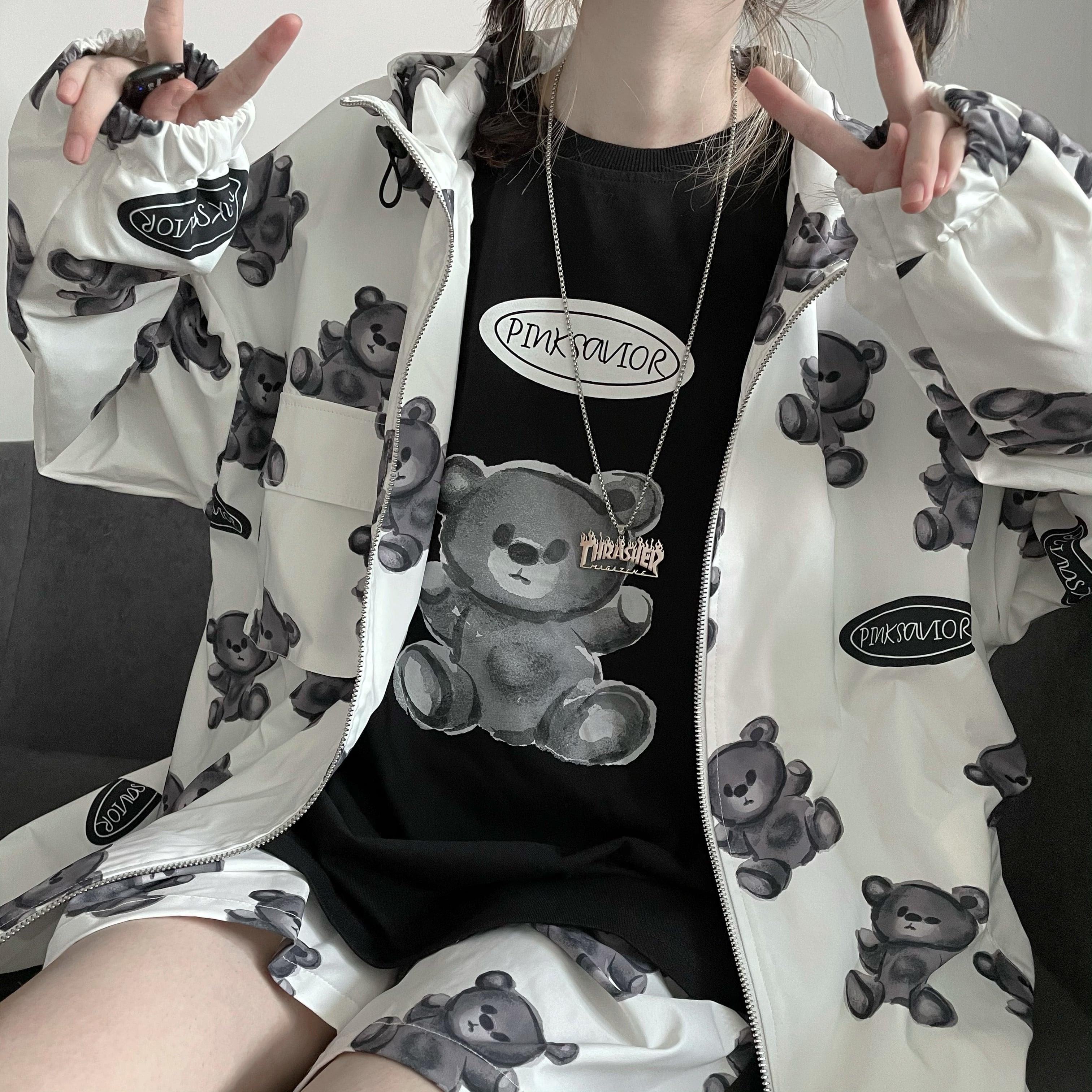 pinksavior夏のフード付き日焼け止めクマプリントジッパートレンチコートショーツスーツ サマー 夏物 ブルマー PSTB60841603104