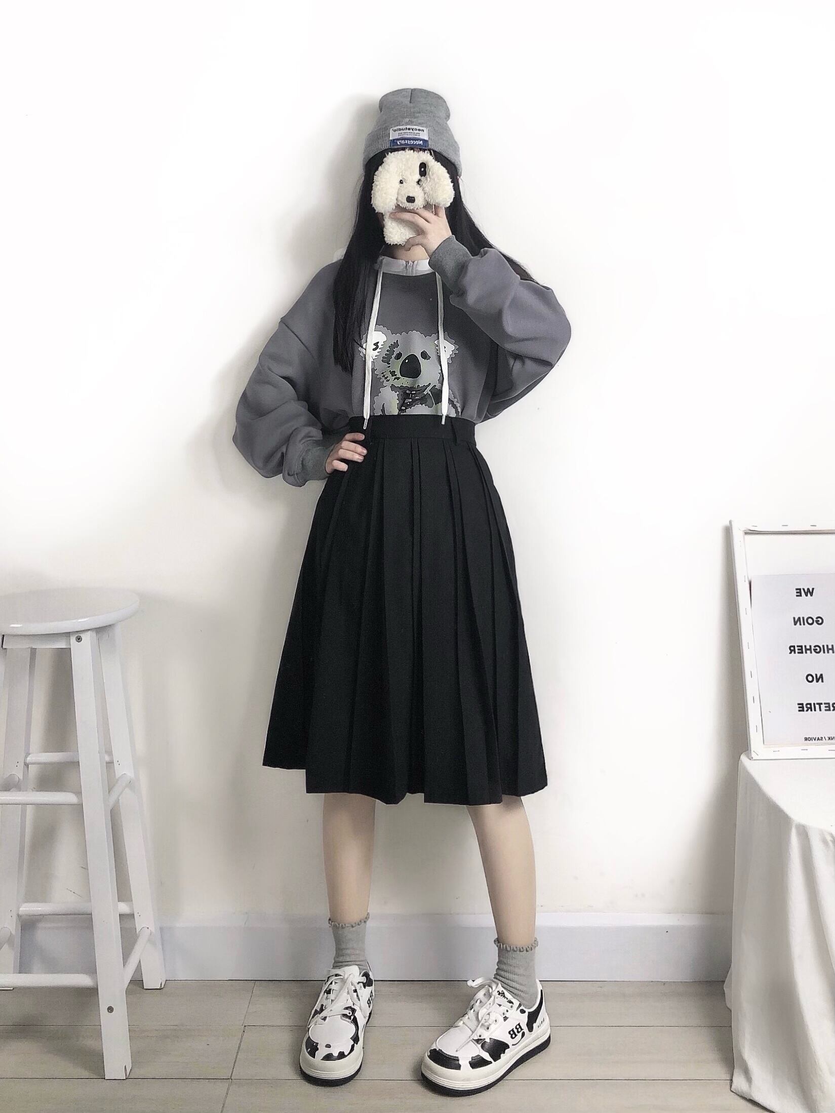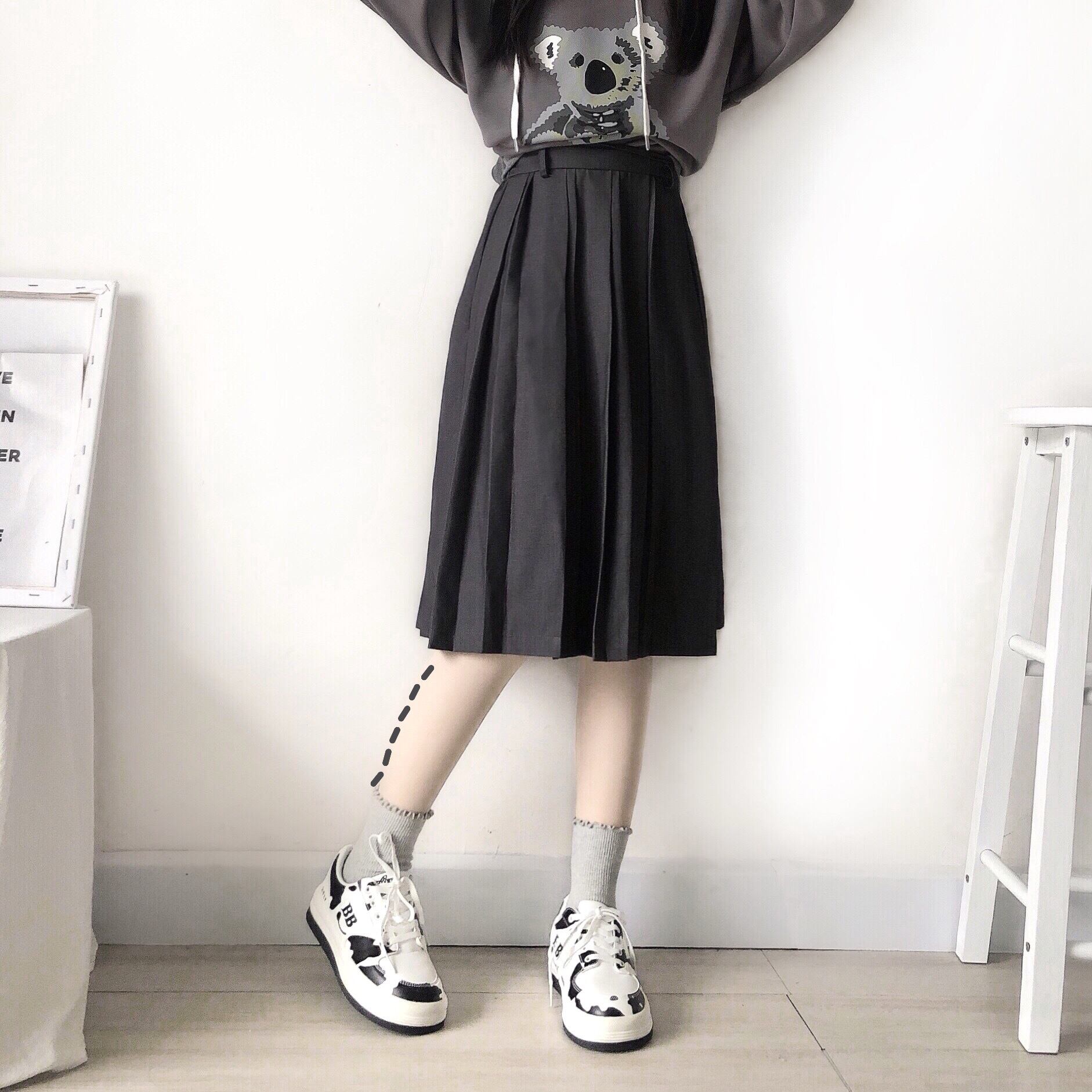 pinksaviorドレープ、特別なプリーツのミドル丈の黒とグレー、薄いスカート ブラック PSTB49042832155