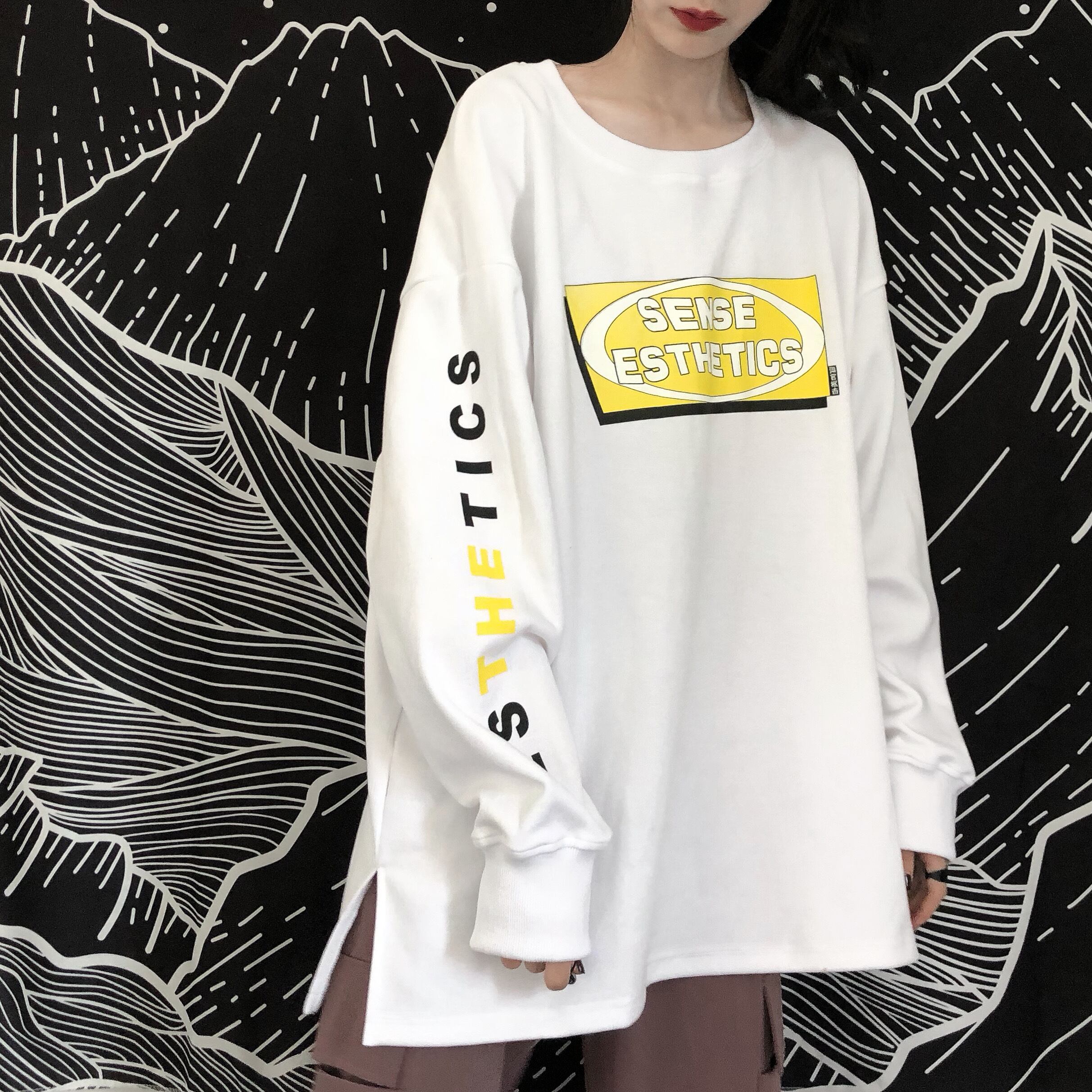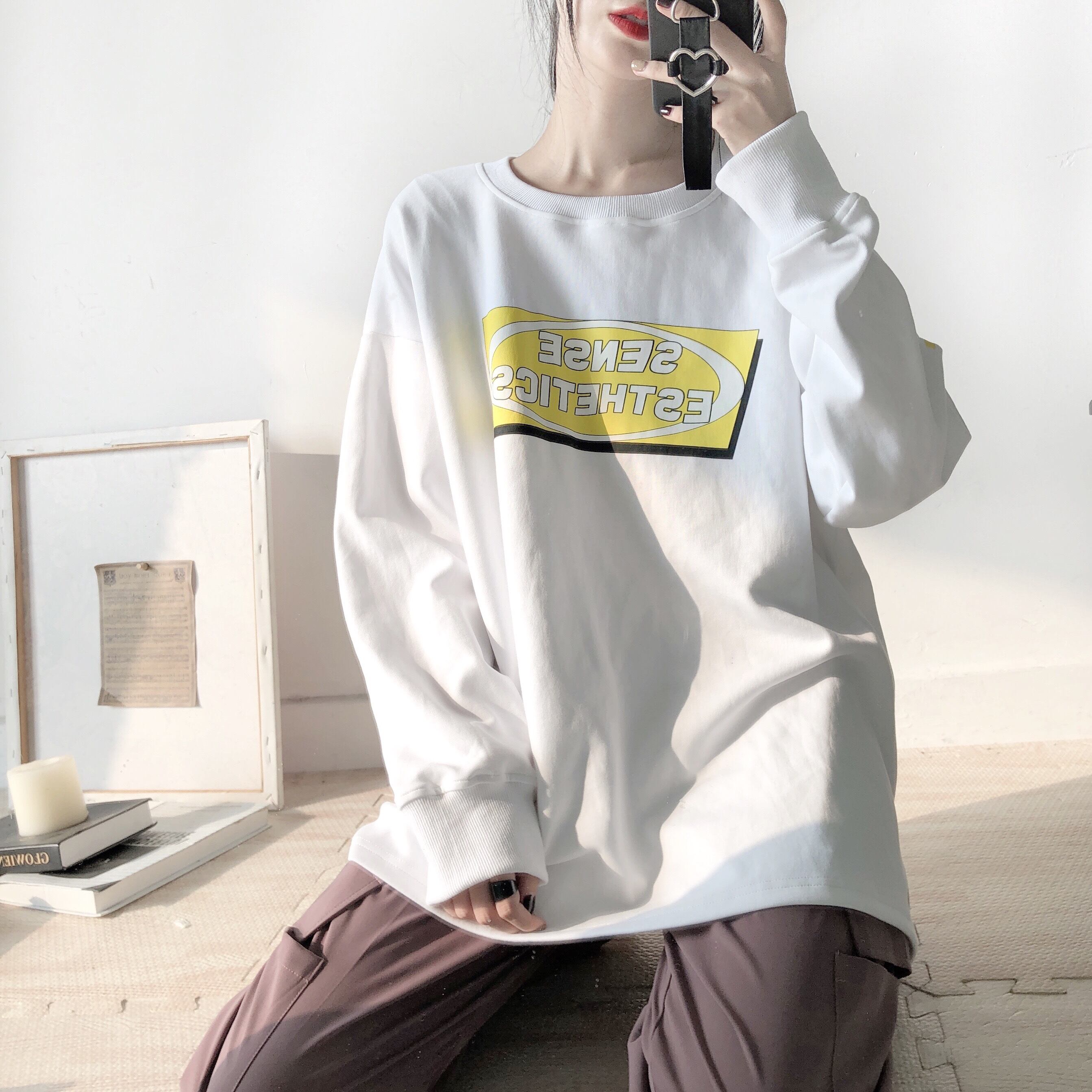 pinksavior黒と白の文字印刷長袖セーター女性のタートルネックラウンドネックテクスチャルーズセーター春と秋 ロング ホワイト ブラック スプリング 春物 オータム 秋物 Oネック PSTB85721705874