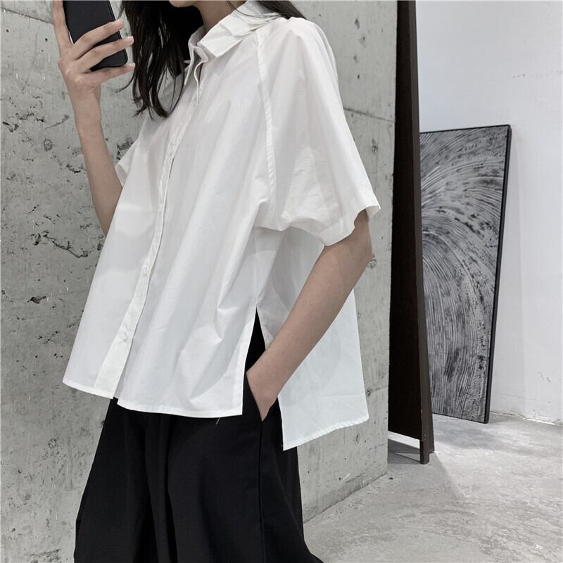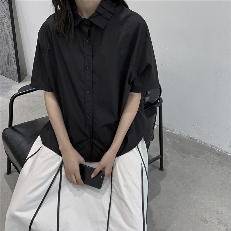 BLACK AND WHITEダークブラック半袖シャツ、コットンネックラインプリーツデザイン、ワイルドルーズオリジナルデザイン ホワイト BWTB91016466034