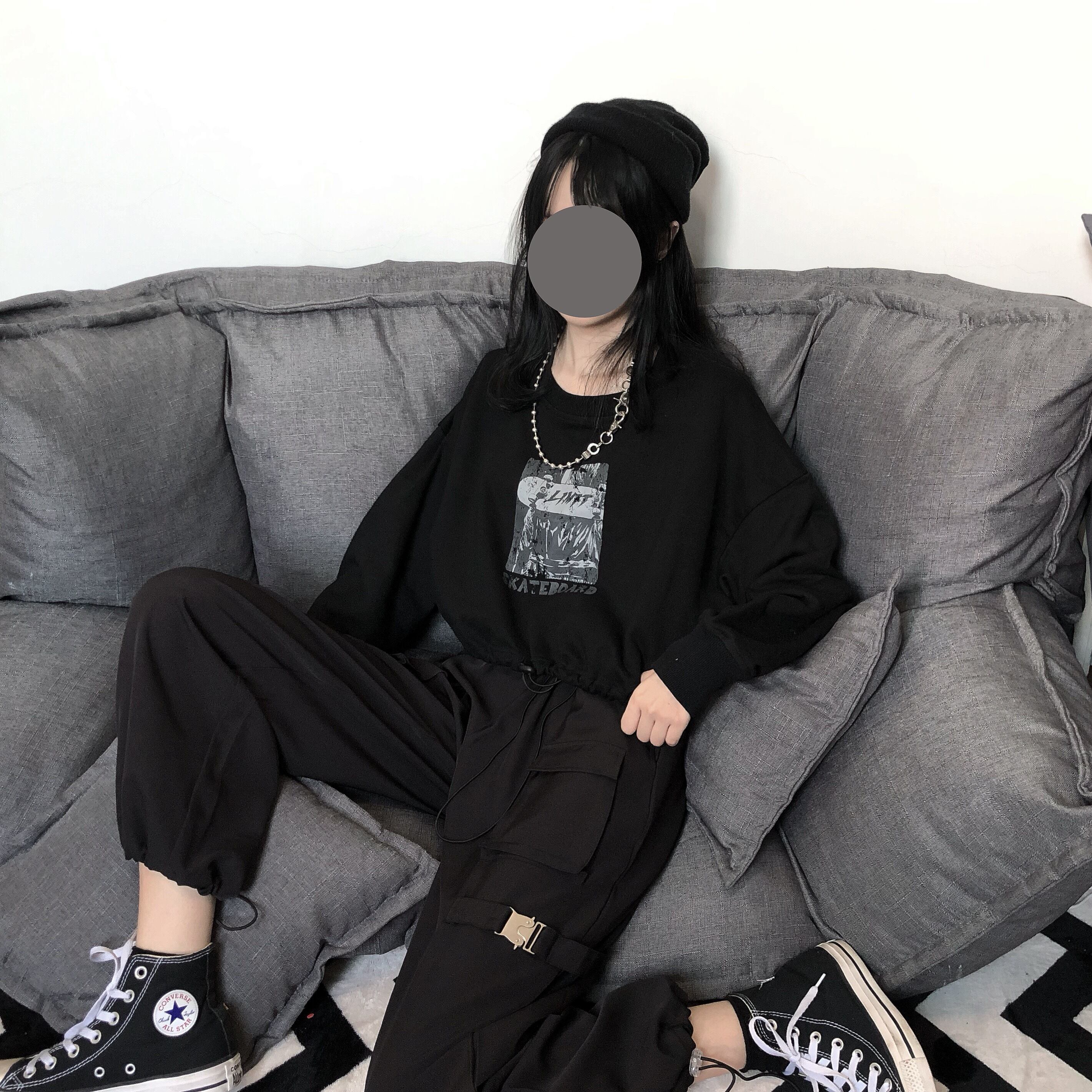 pinksaviorスケートボードエンボスルーズドローストリングクロップトップグレーブラックハイウエストショートセーター女性春と秋 ハイウェスト スプリング 春物 オータム 秋物 PSTB40654233614