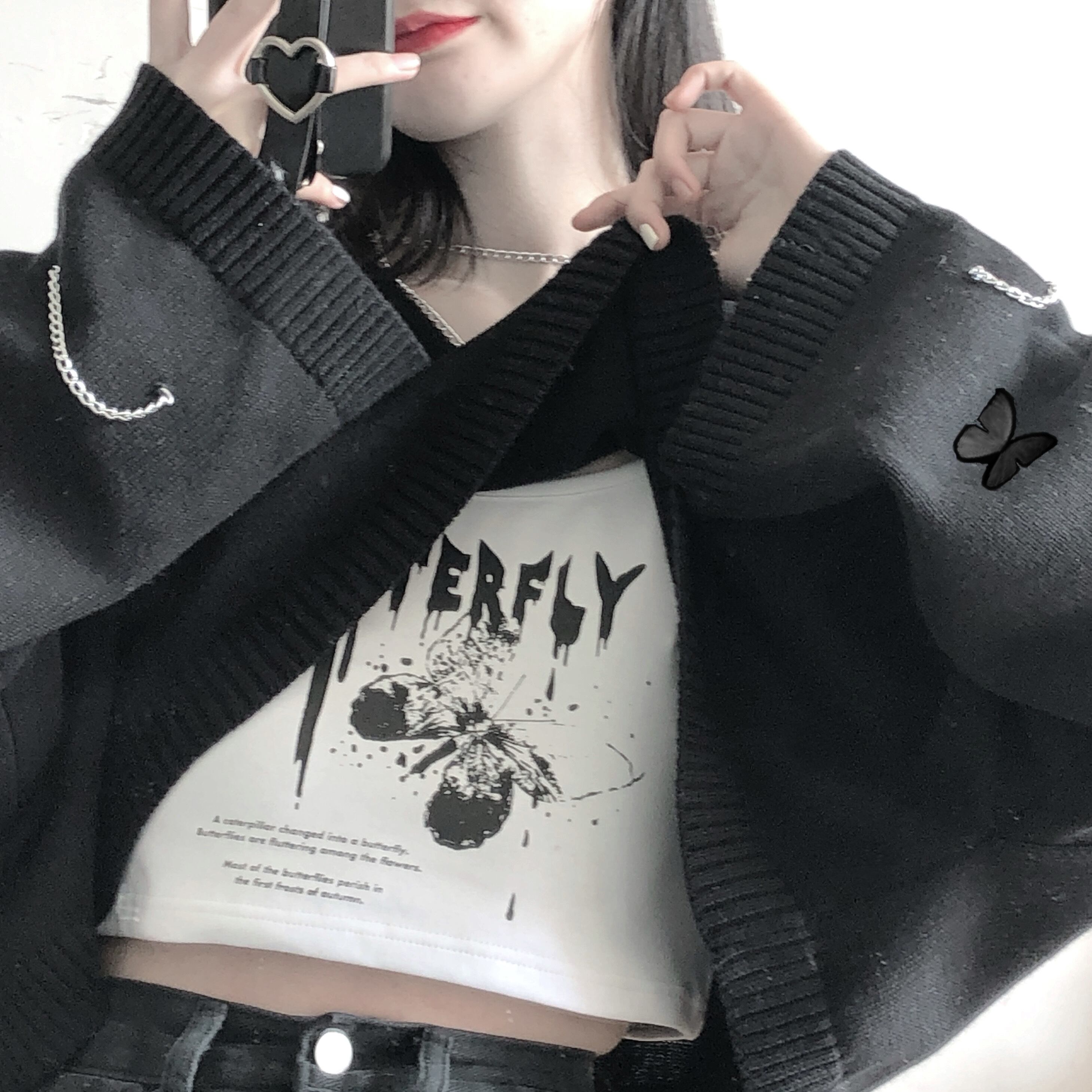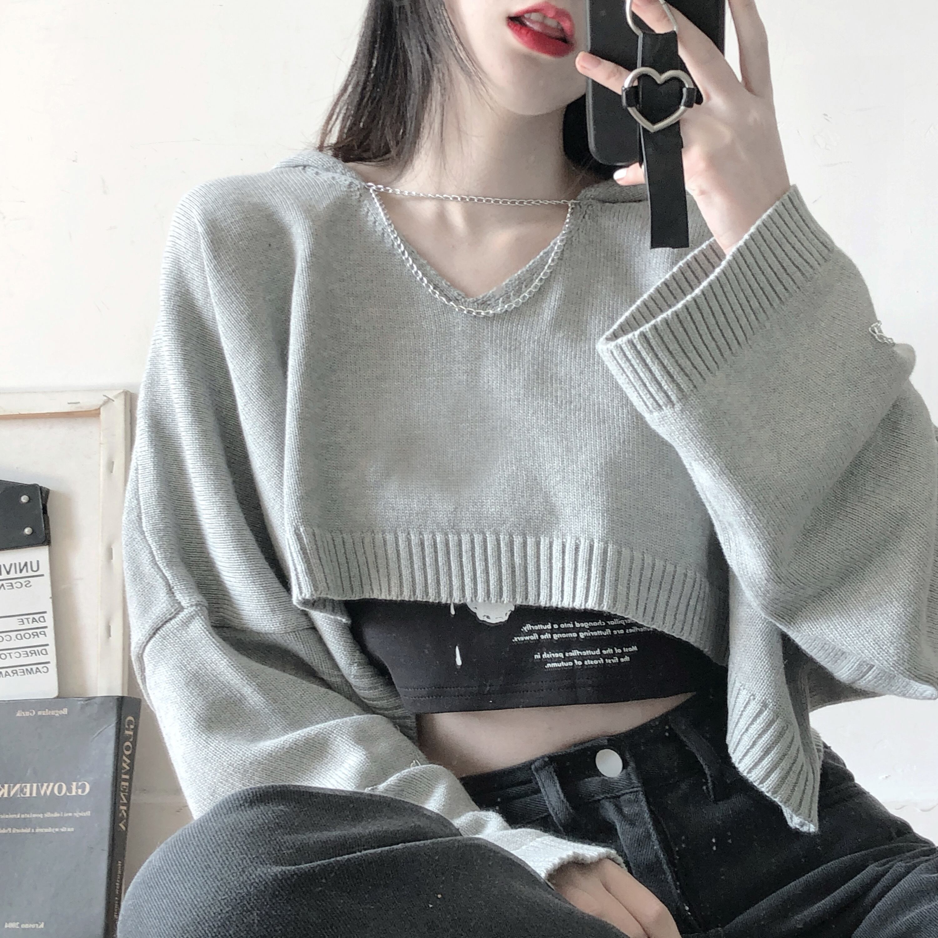 pinksavior[バタフライチェーン]黒とグレーのフード付きチェーンデコレーション早春ショートセーター+サスペンダー ブラック スプリング 春物 PSTB41801911457