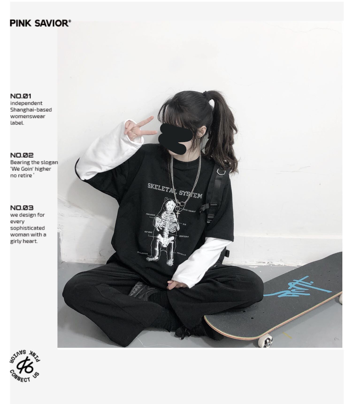 pinksavior秋の黒と白のステッチ学生感覚燃えるような頭蓋骨の骨格印刷長袖Tシャツ女性トップ ロング ホワイト ブラック オータム 秋物 PSTB11603082551