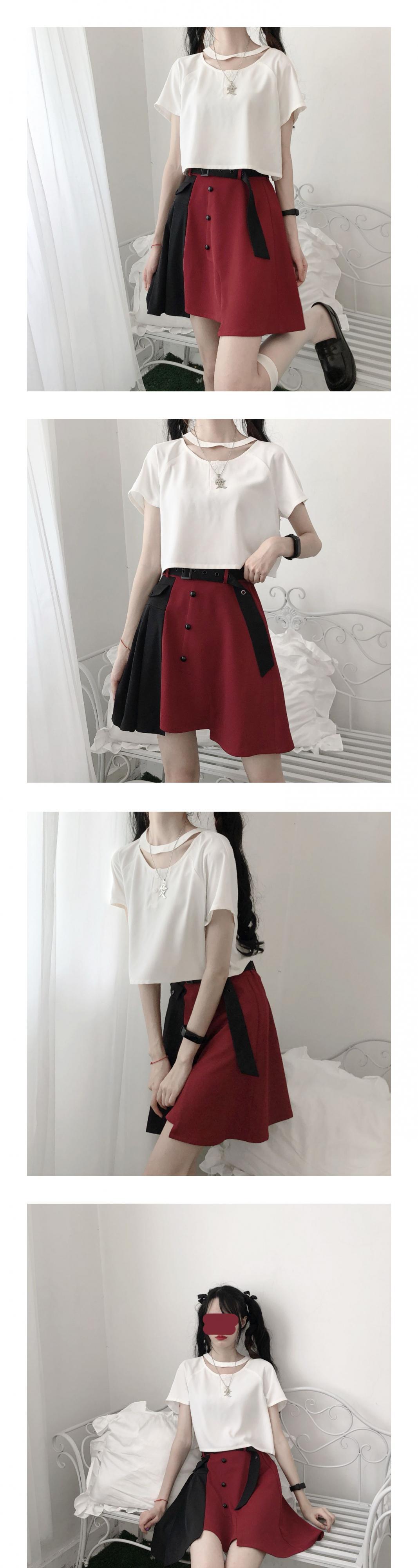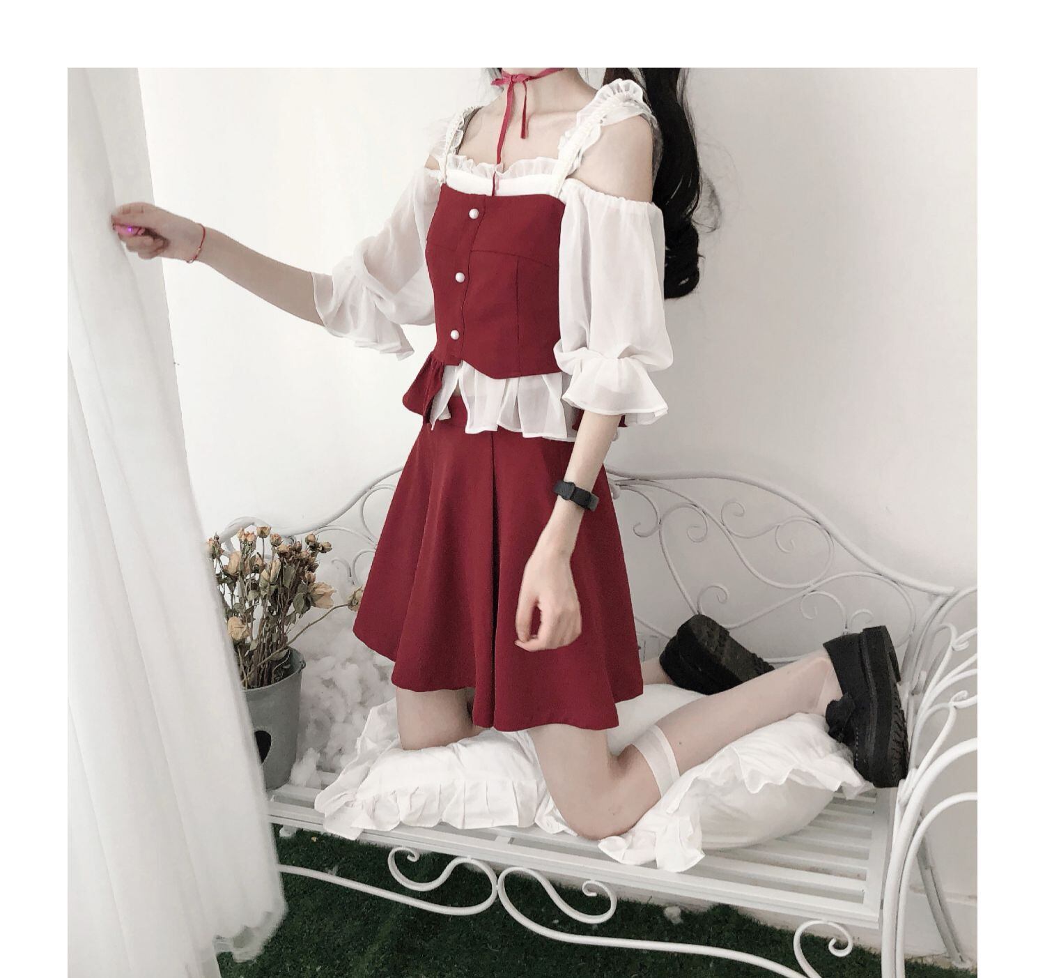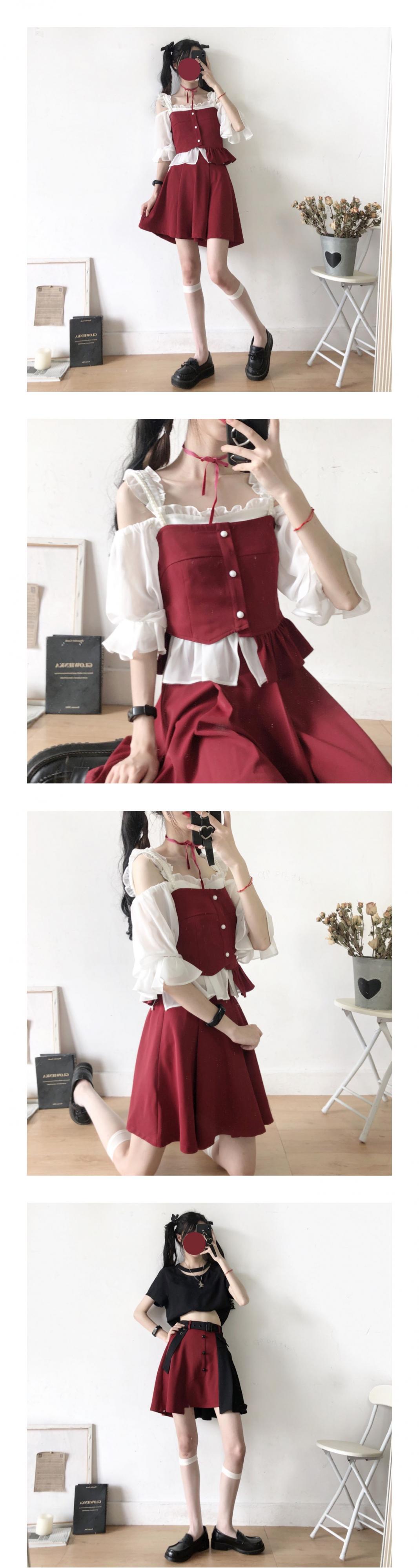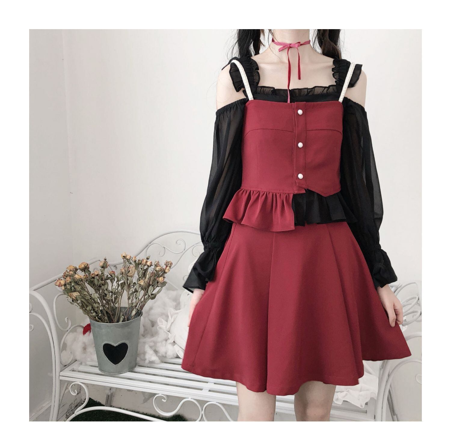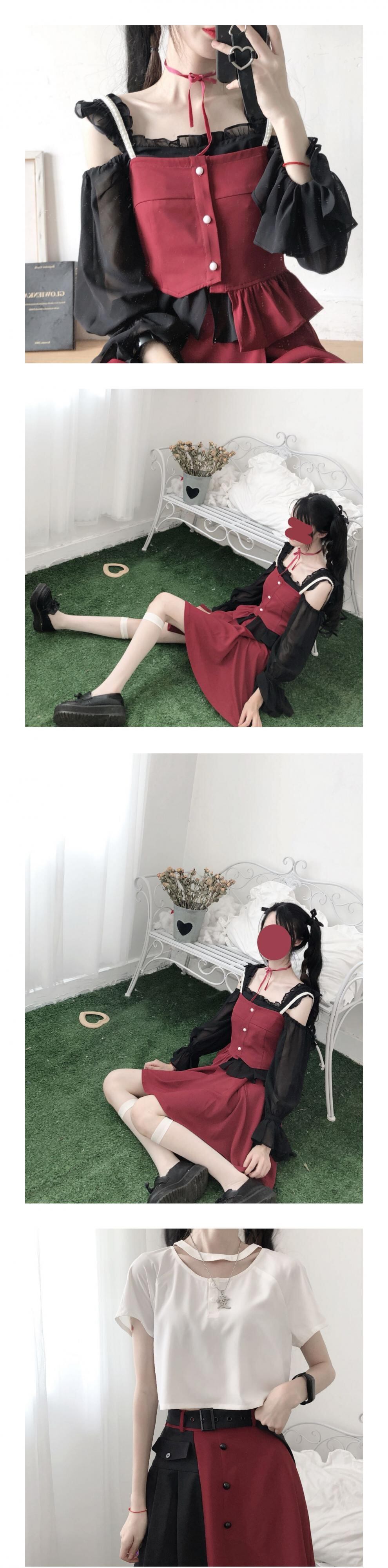 色:ホワイトカラーデザイントップ,ブラックカラーデザイントップ,ポジティブレッドホワイトパールショルダーストラップショートスリング,ポジティブレッドブラックパールショルダーストラップショートスリング,赤いスカート,赤と黒のステッチデザインスカート,ホワイトシフォンベース,ブラックシフォンベース