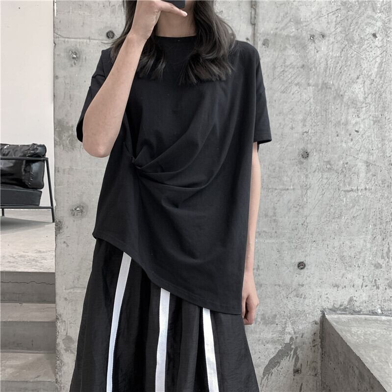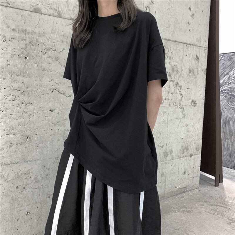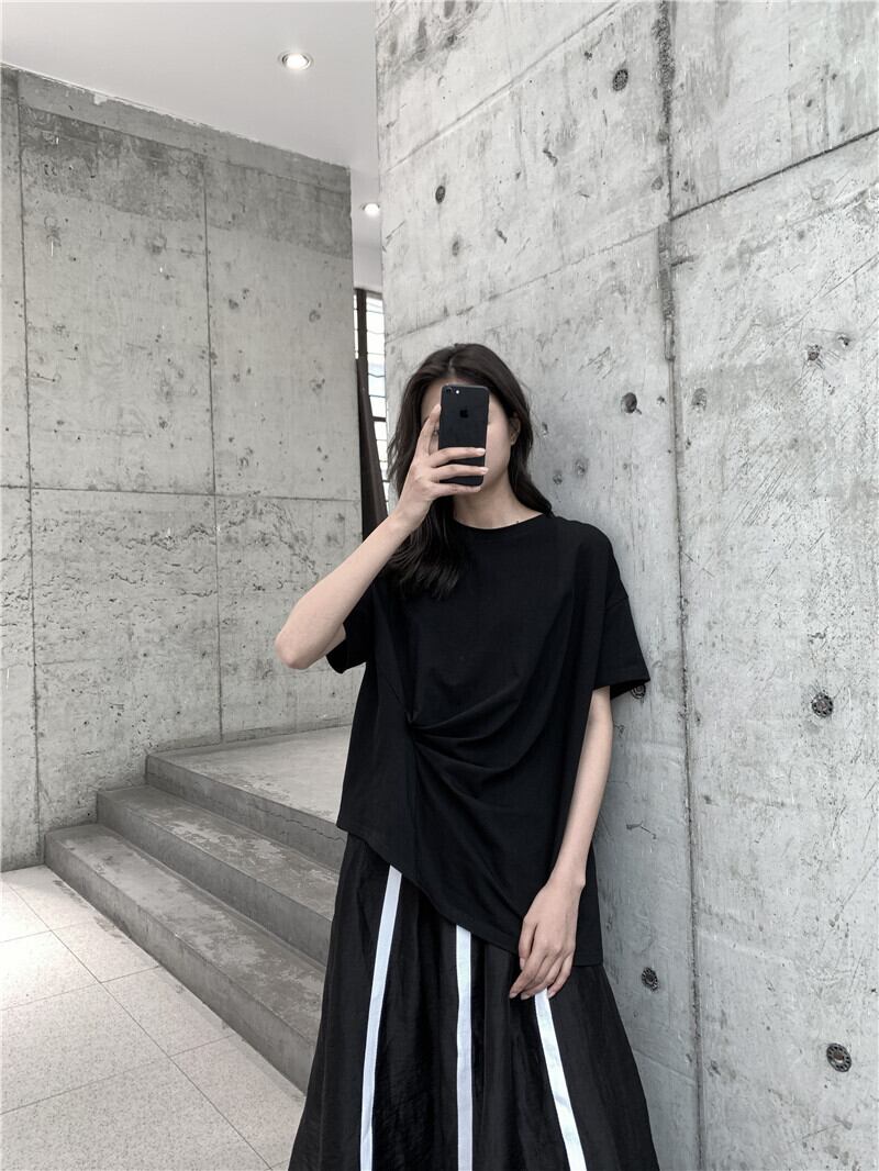 BLACK AND WHITEダークプリーツ半袖Tシャツ綿100%オリジナルデザインニッチルーズラウンドネック ホワイト ブラック コットン Oネック BWTB42177745843