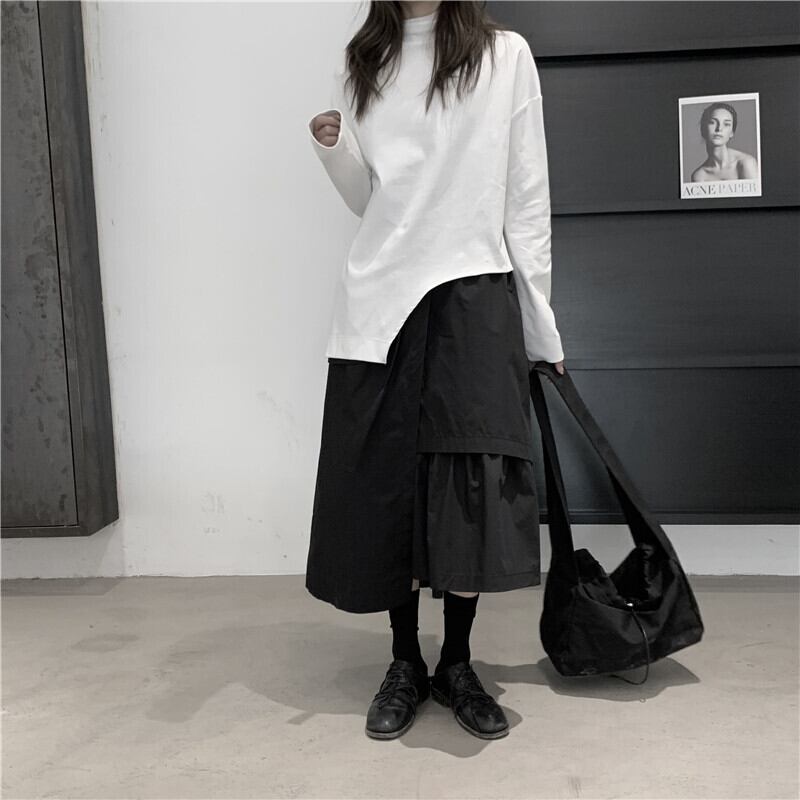 BLACK ANDWHITEダークブラックスカートコットンベルトプリーツ不規則ミドル丈春夏新作 ホワイト スプリング 春物 サマー 夏物 ハーネス BWTB31229395081
