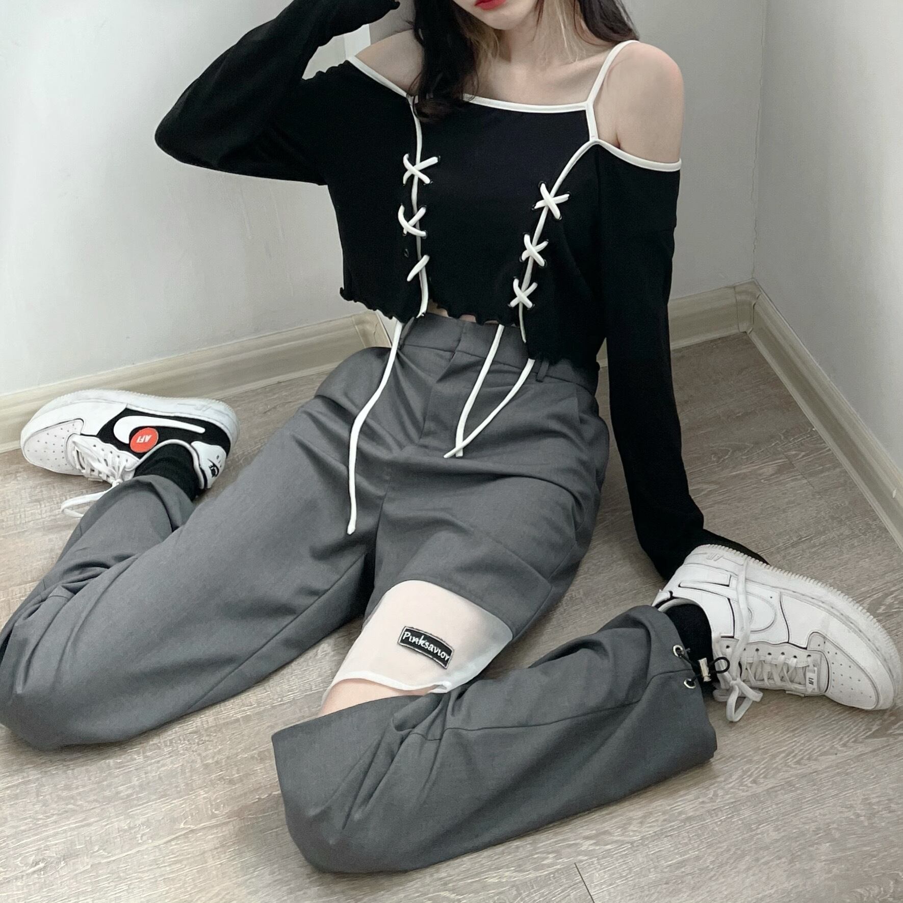 pinksaviorシフォンステッチカジュアルな夏の女性ストレートハイウエストドレープパンツ ハイウェスト サマー 夏物 PSTB90948356237
