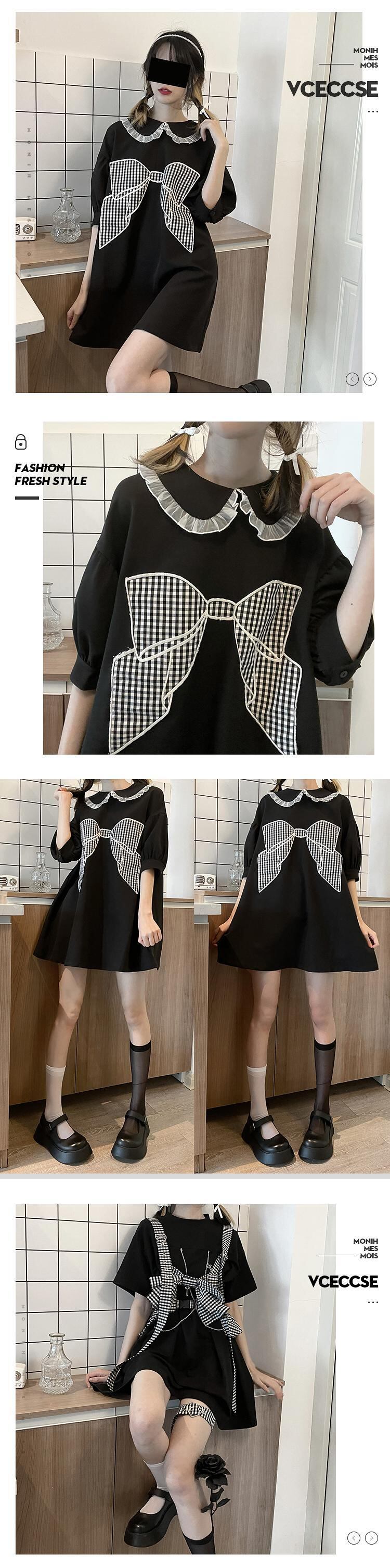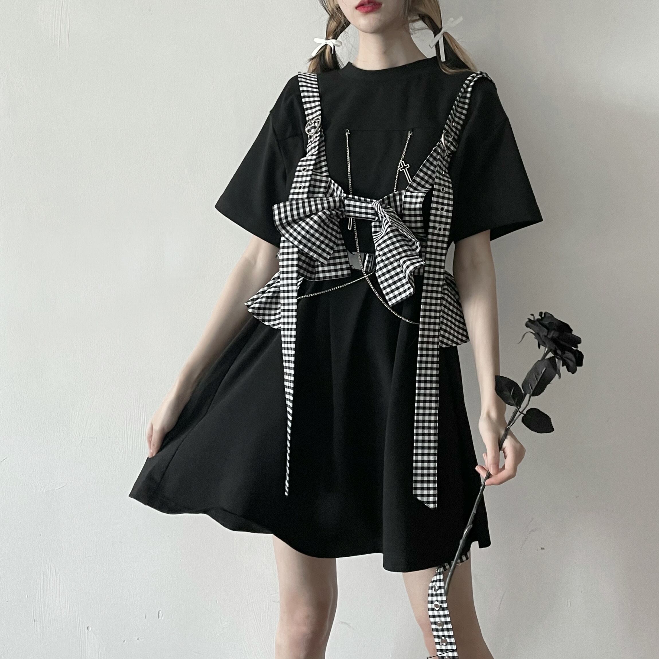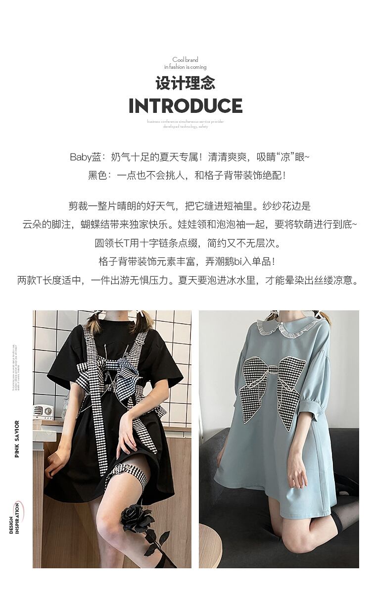 色:ストラップなしの青いラウンドネックロングTは別途購入する必要があります,ストラップなしの黒いラウンドネックロングTは別途購入する必要があります,格子ストラップ装飾,ブラックドールカラーレース刺繡ロングTスカート,ブルードールカラーレース刺繡ロングTスカート