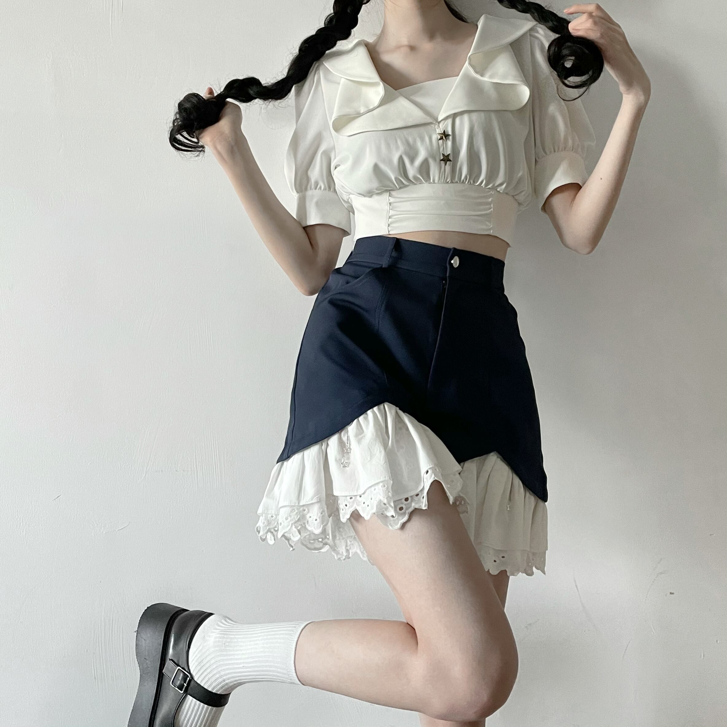 色:ホワイトショートトップスポット,ネイビーショーツ,セーラードレス在庫あり