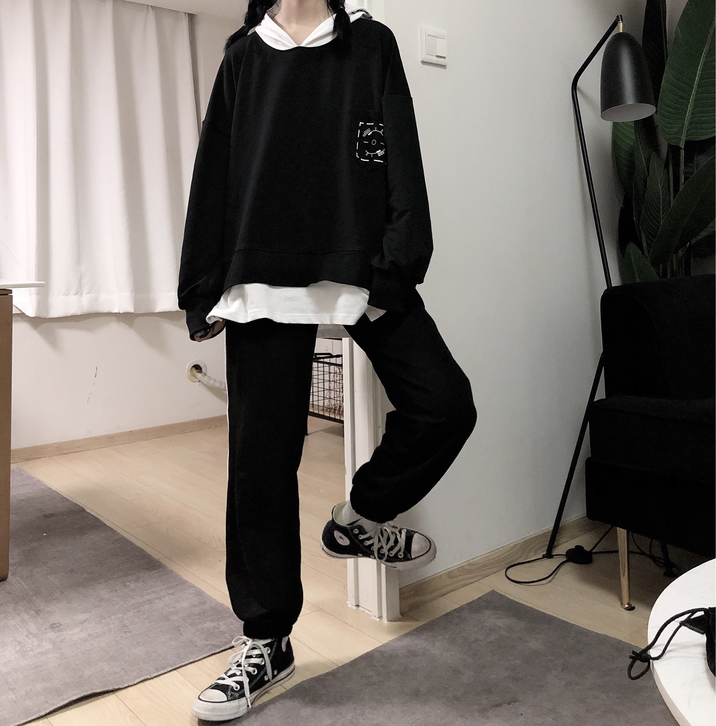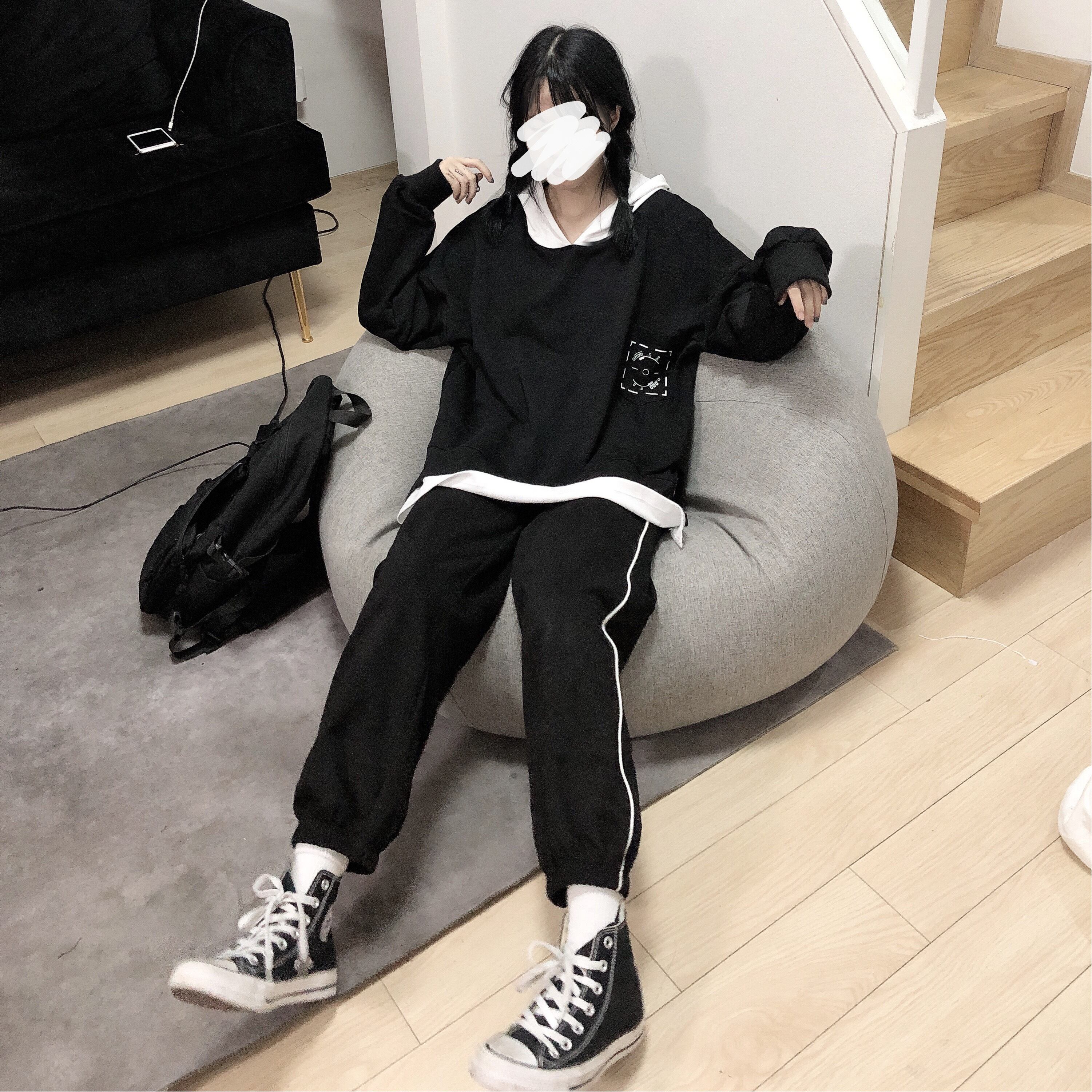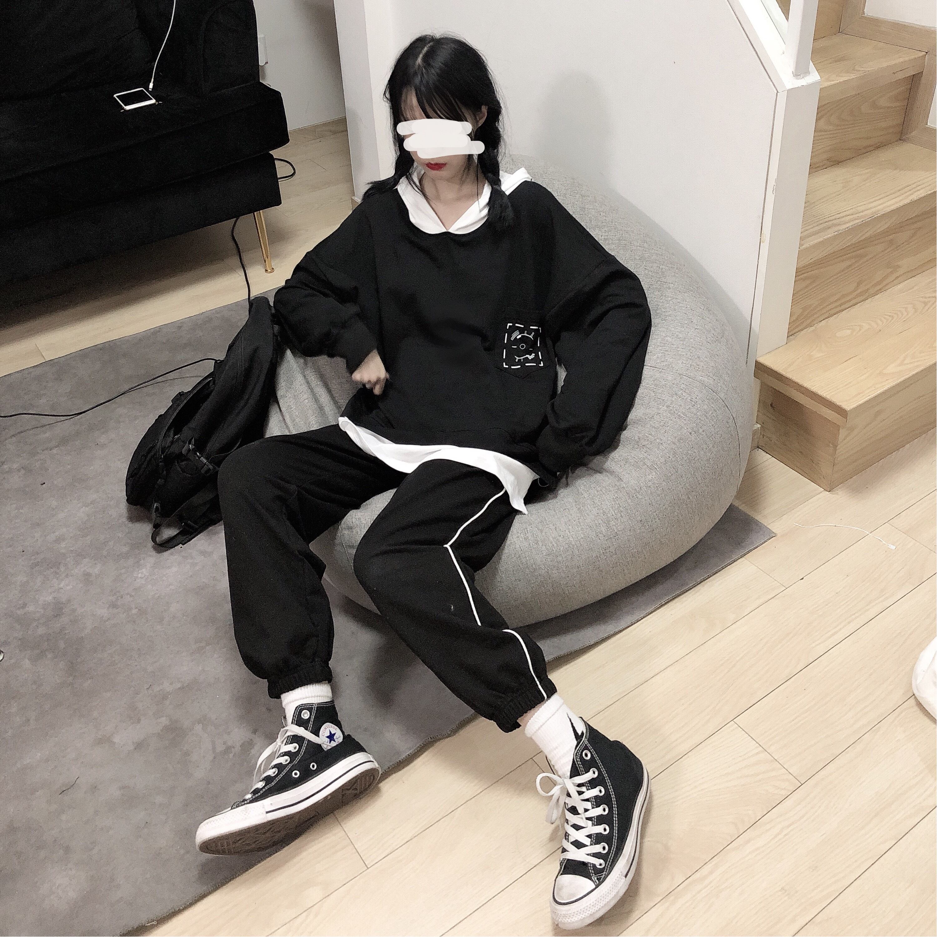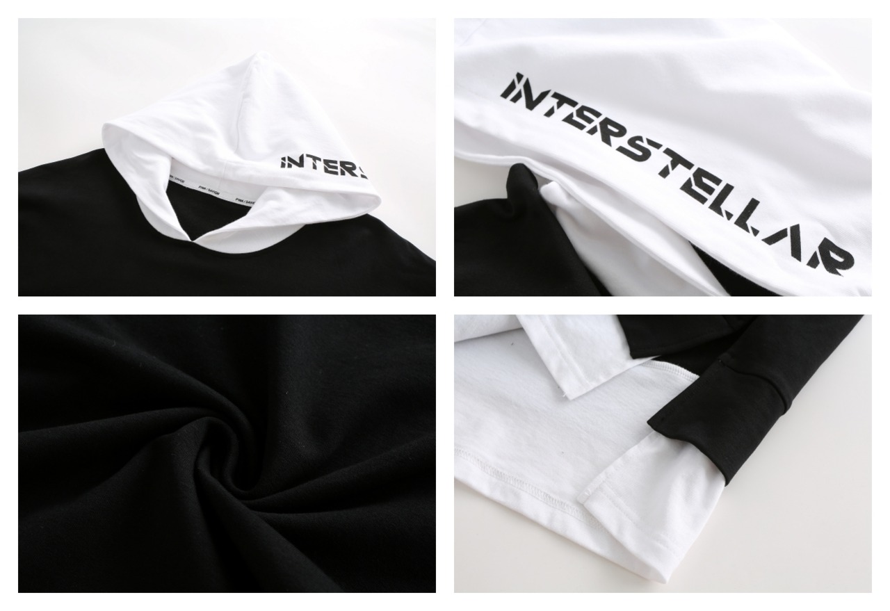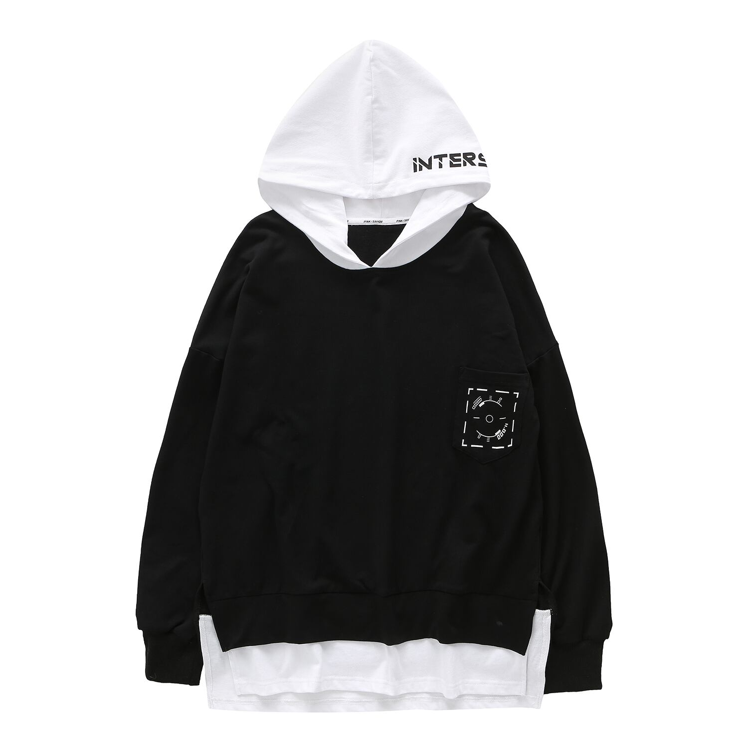 pinksavior星間デザイン黒と白のコントラストカラー偽のツーピースセーター女性春と秋の薄いフード付きセータールーズ ホワイト ブラック スプリング 春物 オータム 秋物 PSTB53587670728