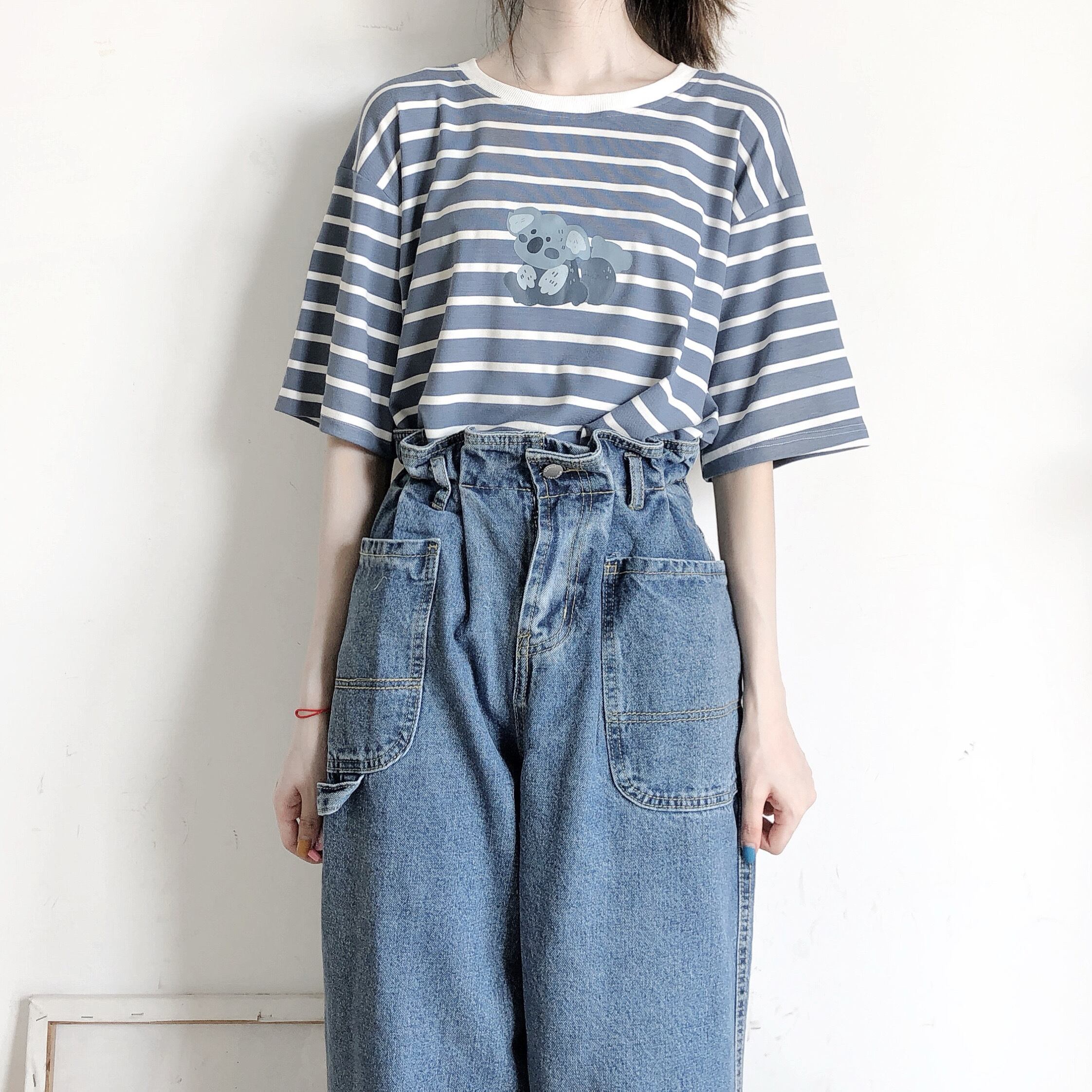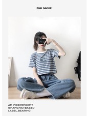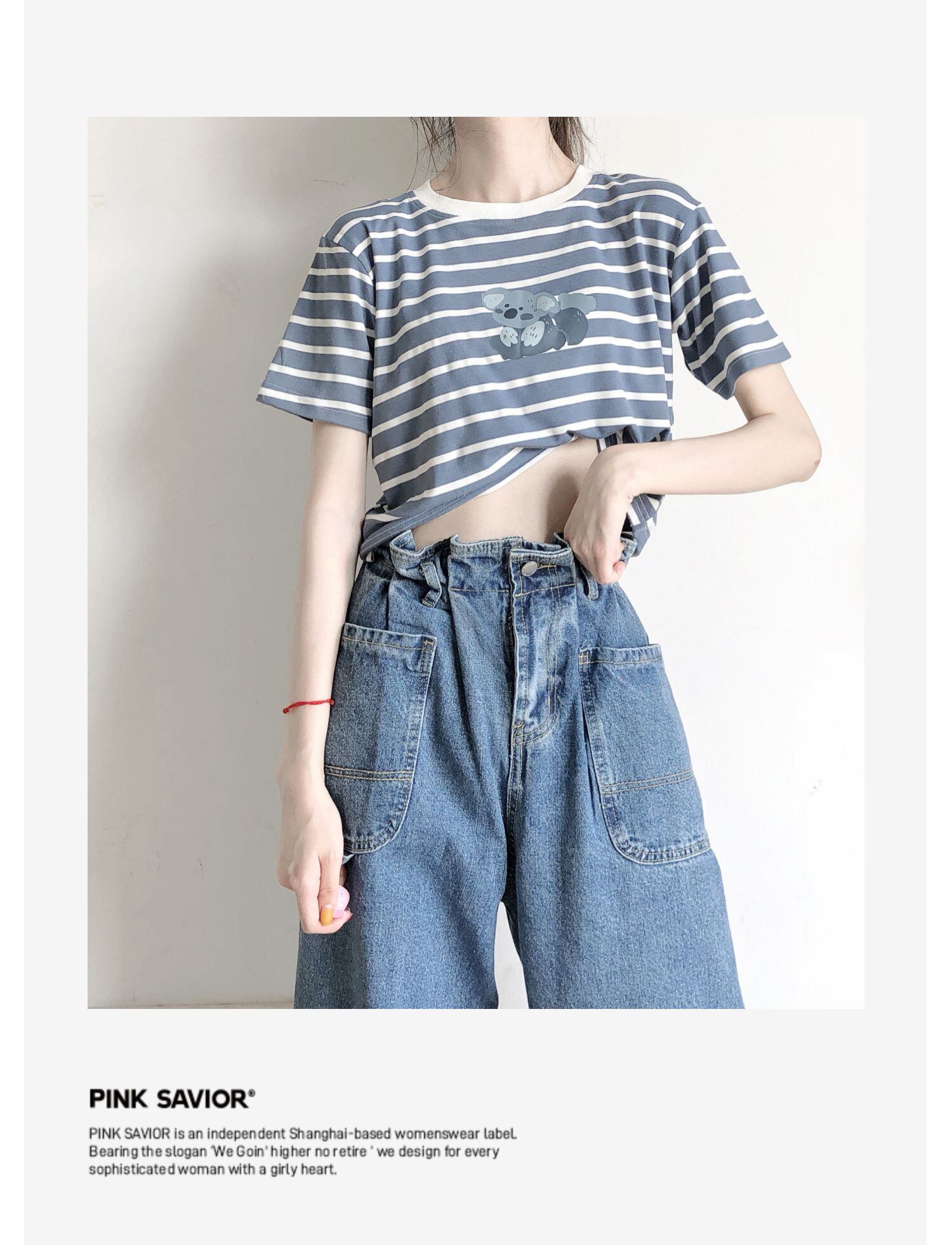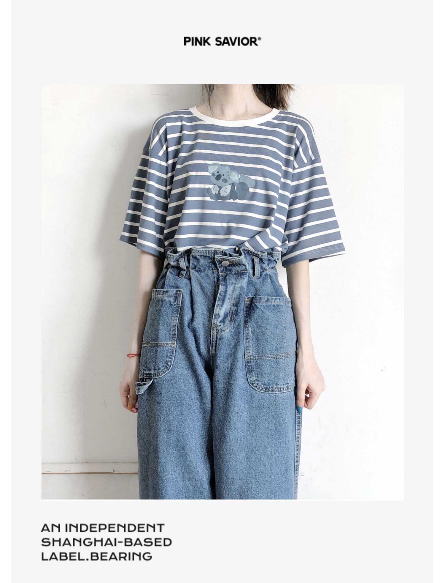 pinksavior青と白の縞模様のコアラかわいいストレッチモーダルアイスシルクテクスチャTシャツ女性の夏のショートトップ ホワイト ブルー 大人ガーリー スウィート キュート カジュアル サマー 夏物 ストライプ PSTB9028641955