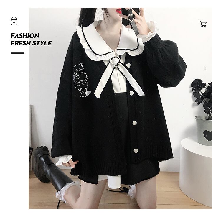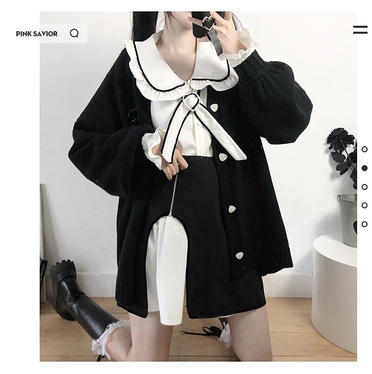 色:黒いセーターコート,レースの白いシャツ,黒と白のステッチスカート