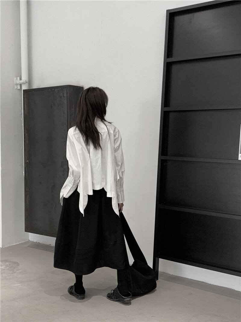 BLACK ANDWHITEダークブラックシャツ長袖レディースアシンメトリーデザインコットンオールマッチシャツ ロング ホワイト BWTB45051999012