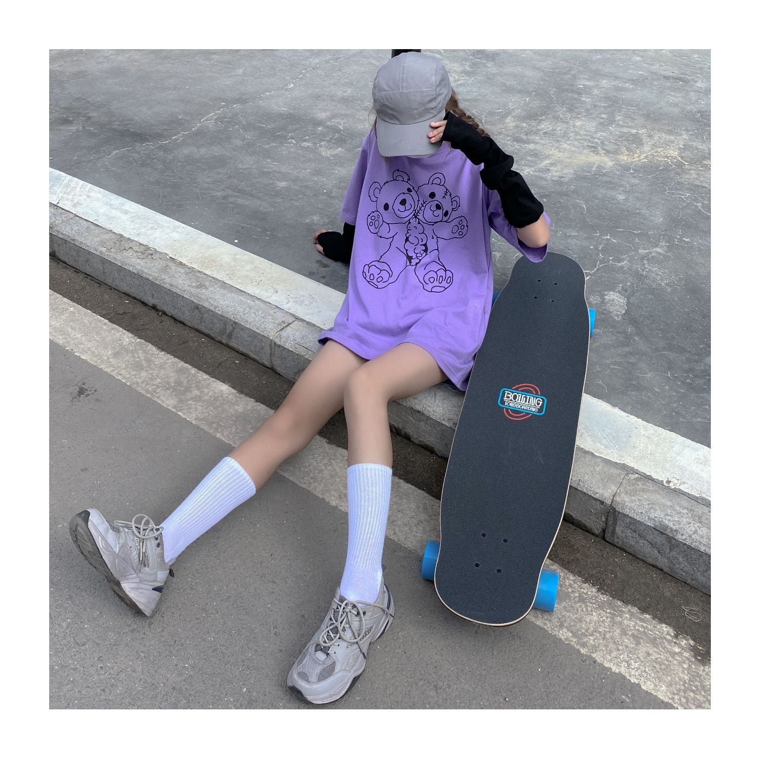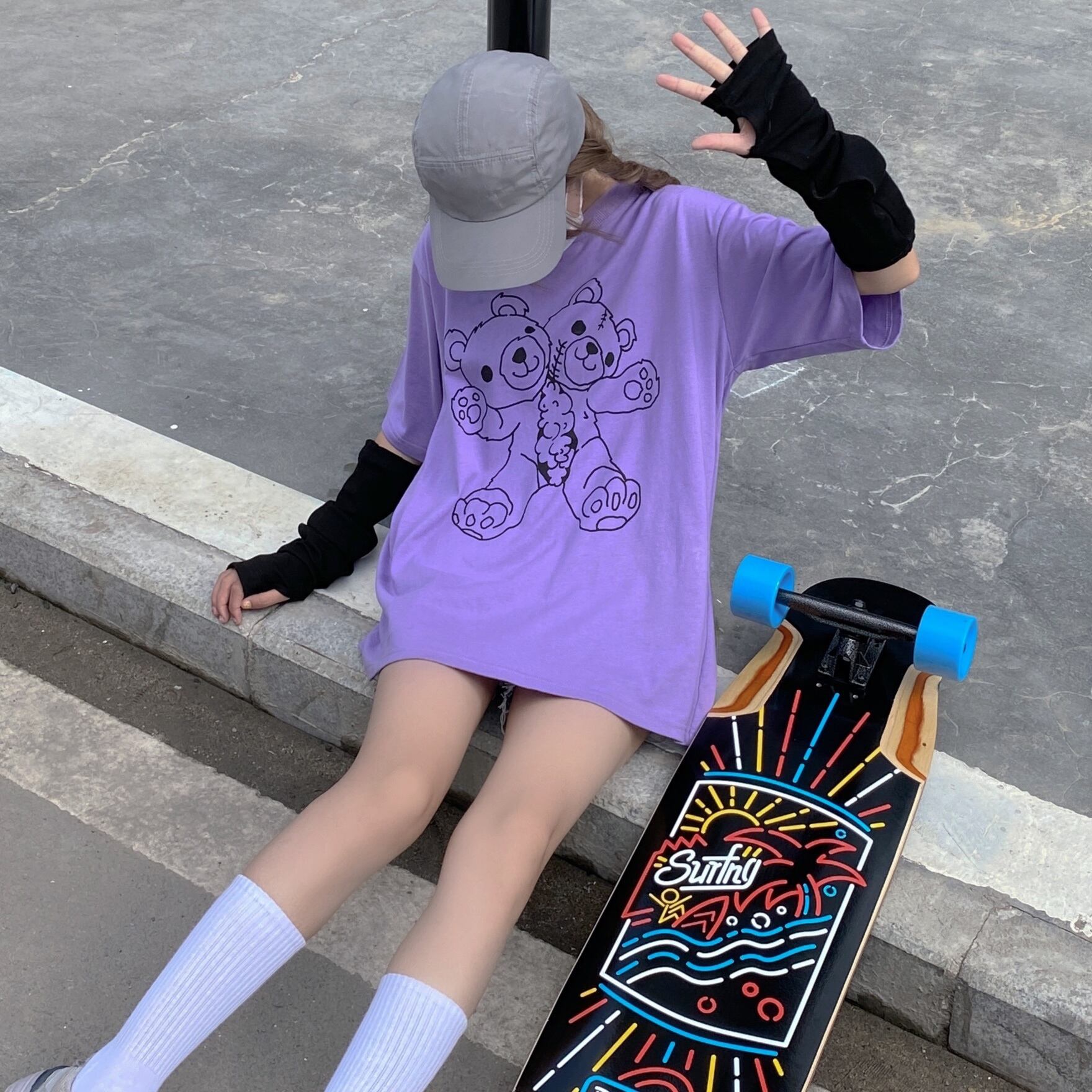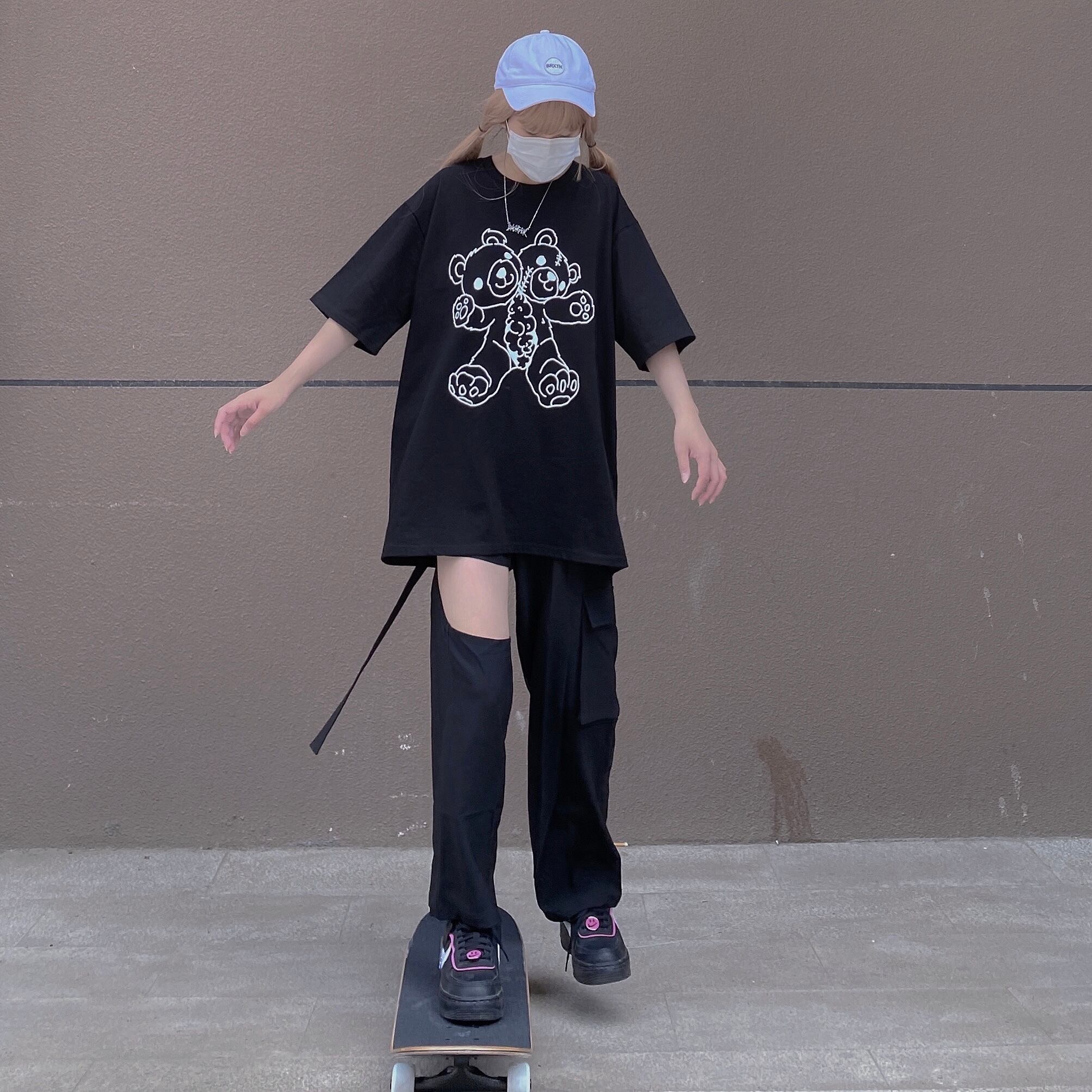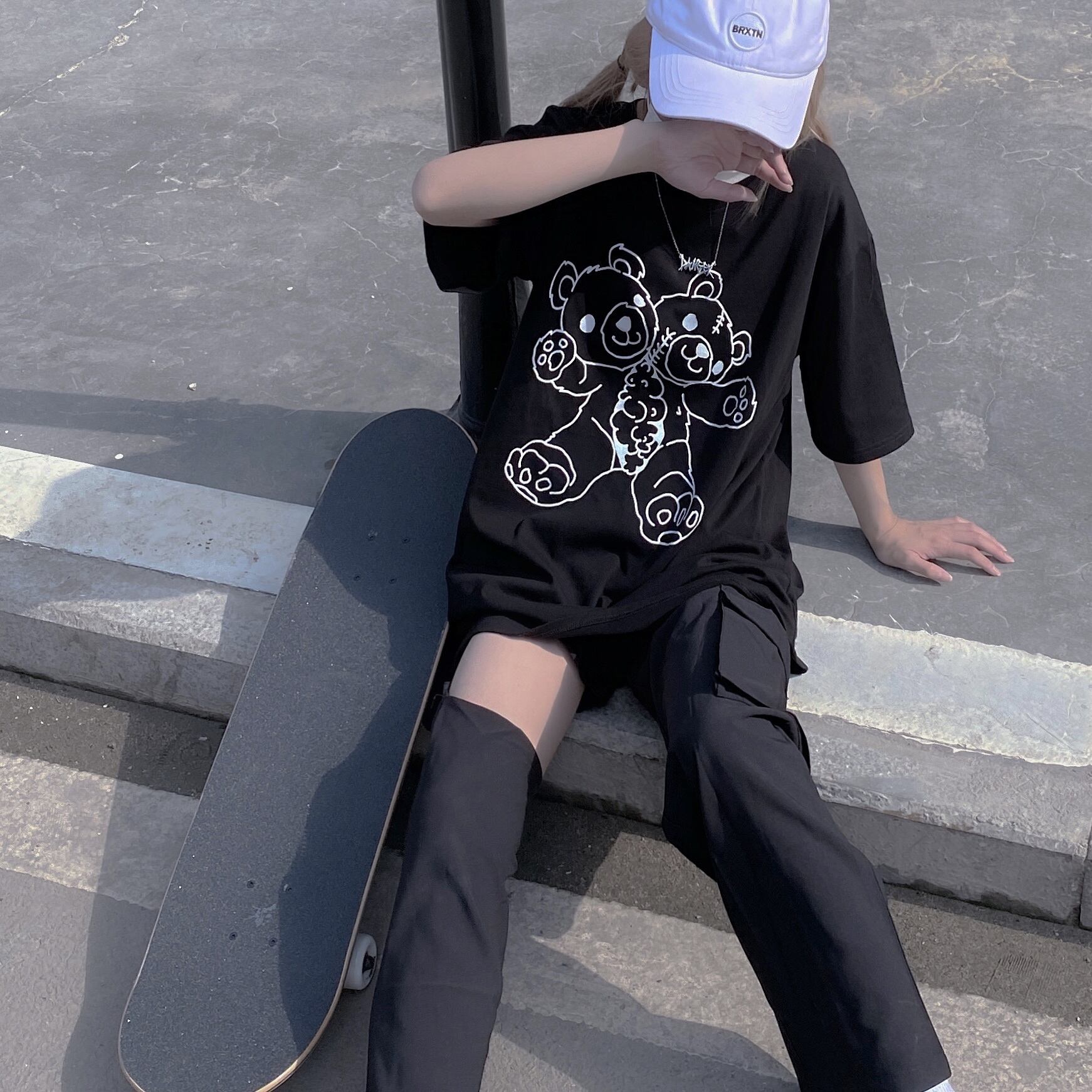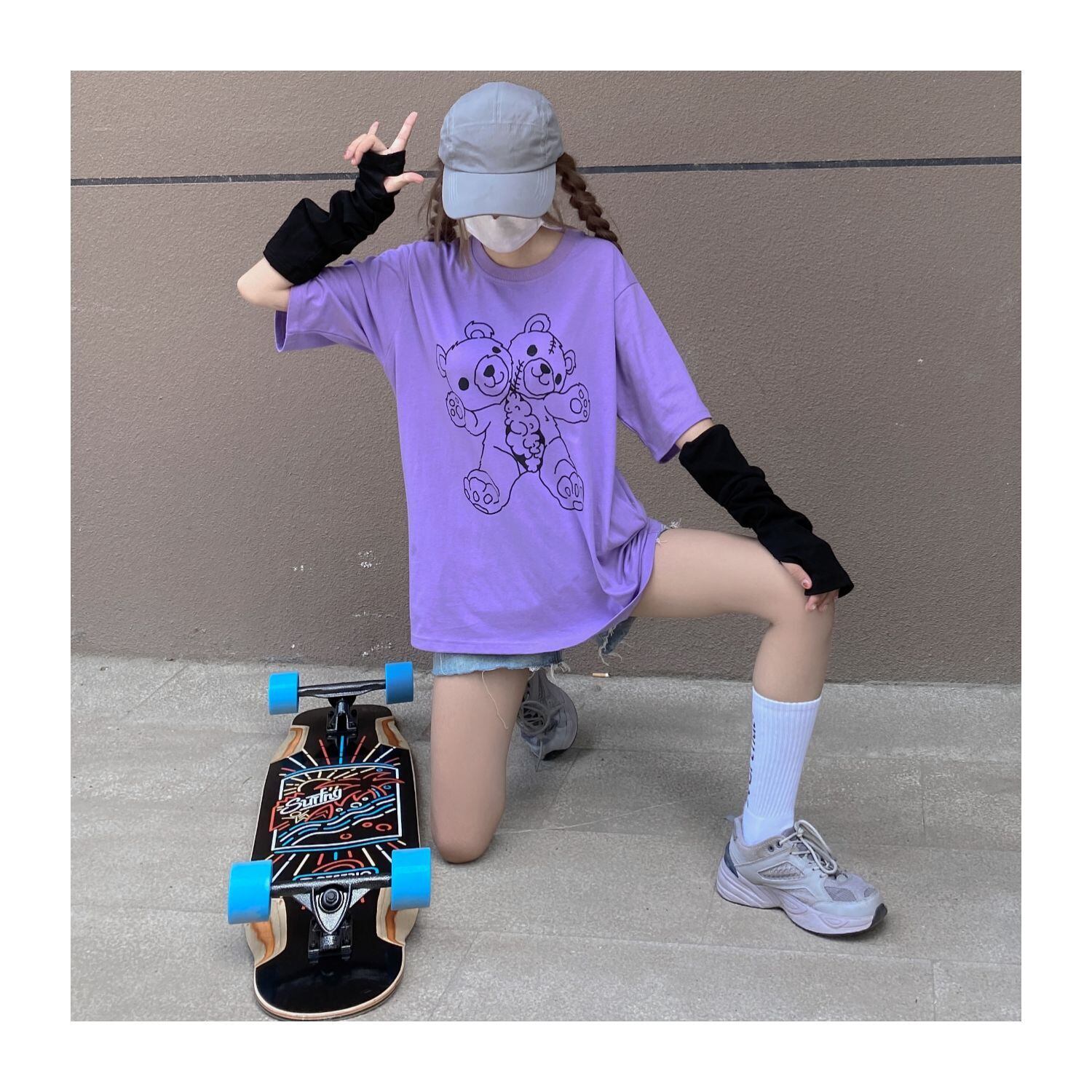 pinksavior黒と紫のプリント人形クマ夏純綿半袖Tシャツ女性ルーズ(袖カバー) ブラック コットン サマー 夏物 ピュア パープル PSTB77230711406