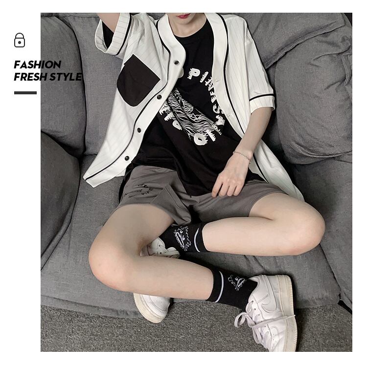色:ホワイトストライプ野球ユニム,BaiXiaワンiテイク,黒のカジュアル半袖,グレーのショートパンツ,ブラックスリングドレス