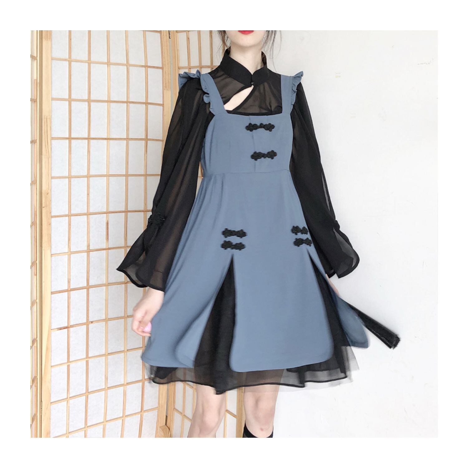 色:中国のディスクバックルベストスカート(糸付き)在庫あり,大きな袖の黒いガーゼボトミング在庫あり,ブラックショートバックルトップ入荷,グレーブルーのディスクバックルスカート在庫あり