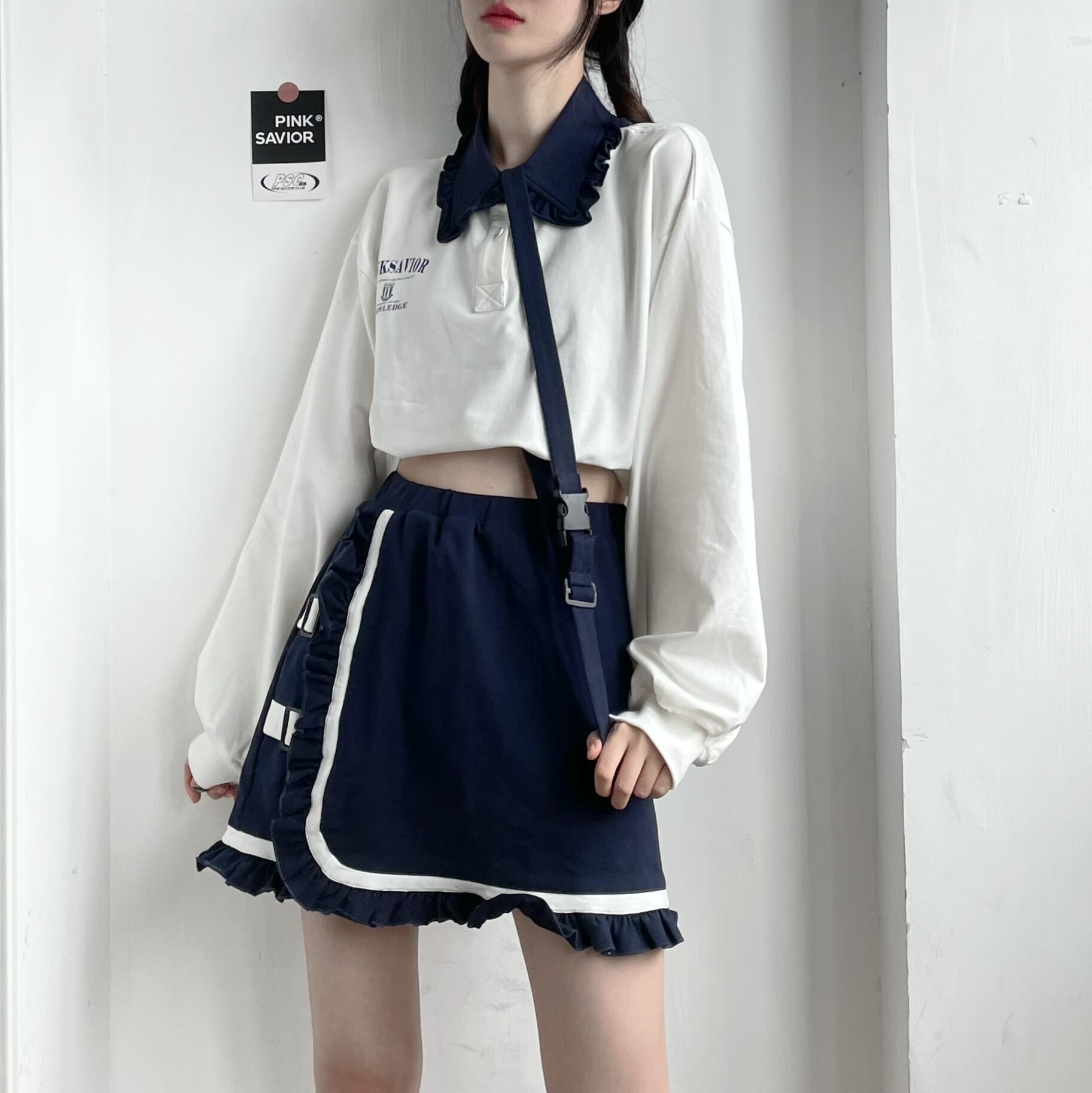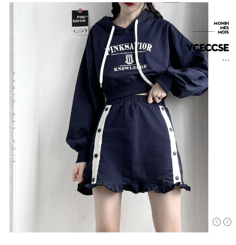 色:ホワイトカレッジトップ,ネイビーブルーのフード付きショートセーター,ネイビーの隠しボタンスカート,ネイビーブルーの調節可能なボタンスカート