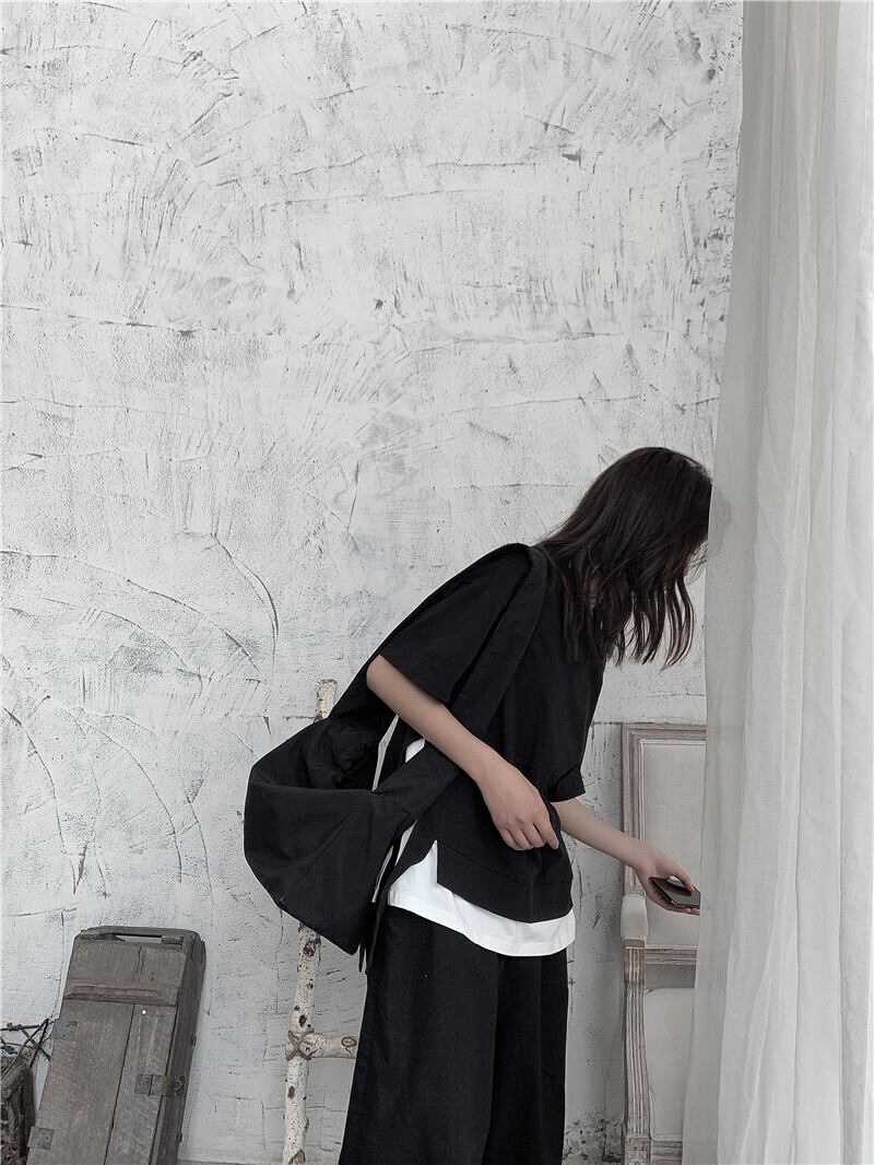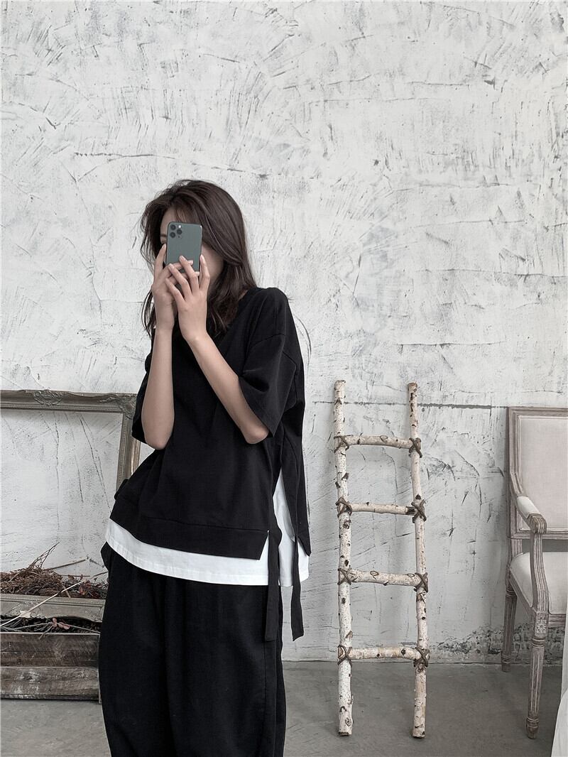 黒と白のダークフェイクツーピース半袖Tコットンルーズカップル男性と女性 ホワイト ブラック BWTB86697737088