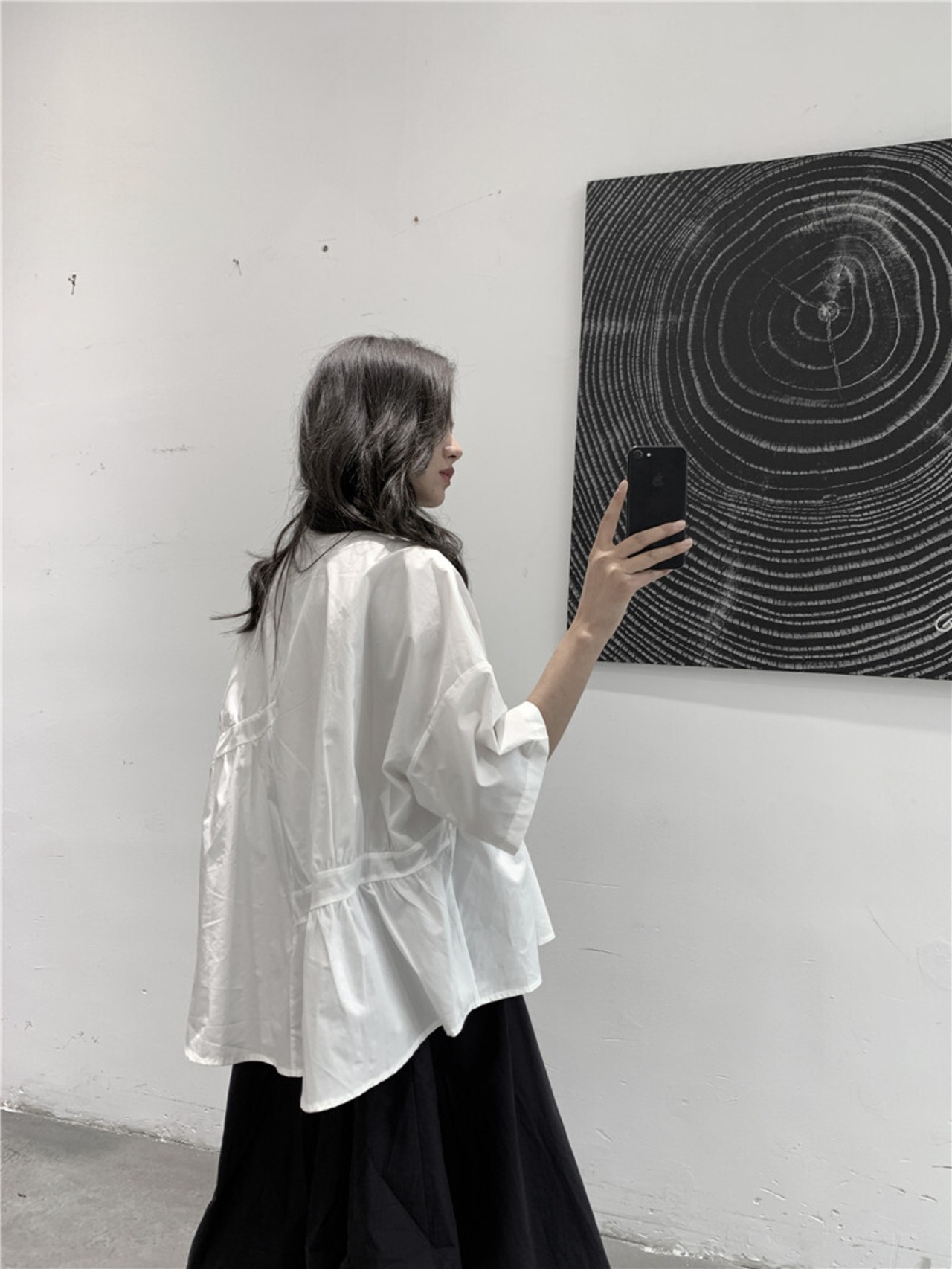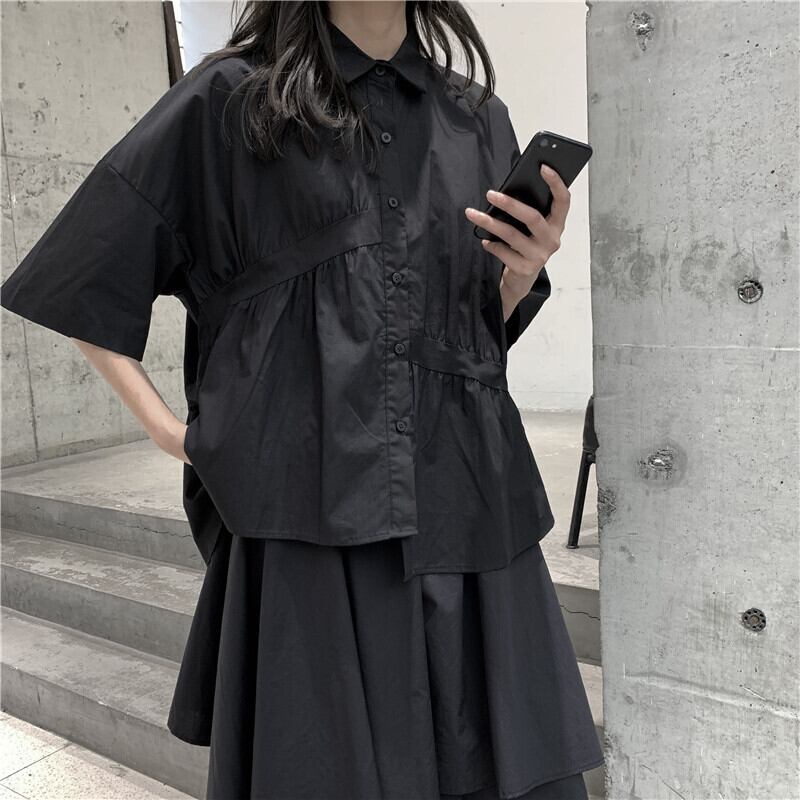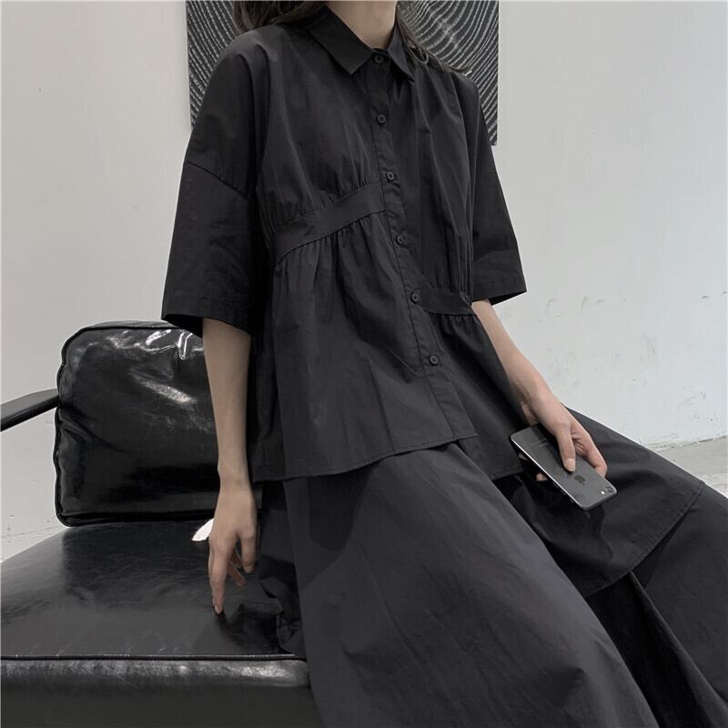 BLACK ANDWHITEダークブラックシャツ女性プリーツデザインコットン半袖夏新作ニッチルーズ ホワイト サマー 夏物 BWTB70403574248
