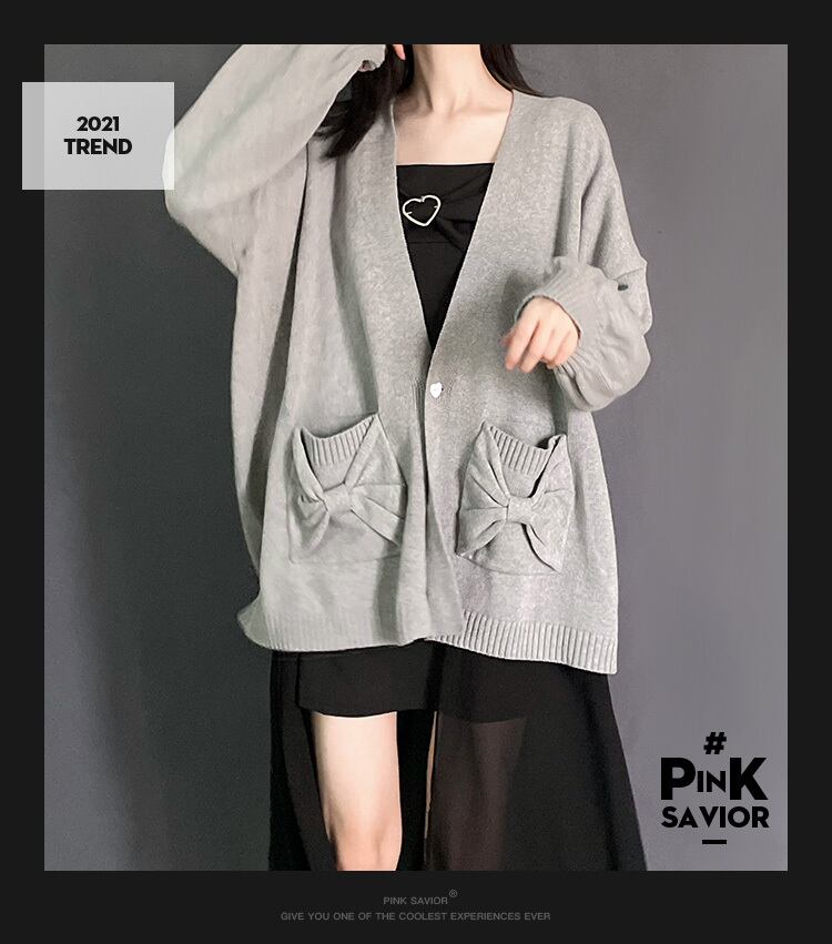 pinksavior弓ポケットデコレーション秋冬ルーズブラックとグレーの2色カジュアルコロケーションは薄手のセーターコートでした リボン オータム 秋物 ウィンター 冬物 PSTB39135072192