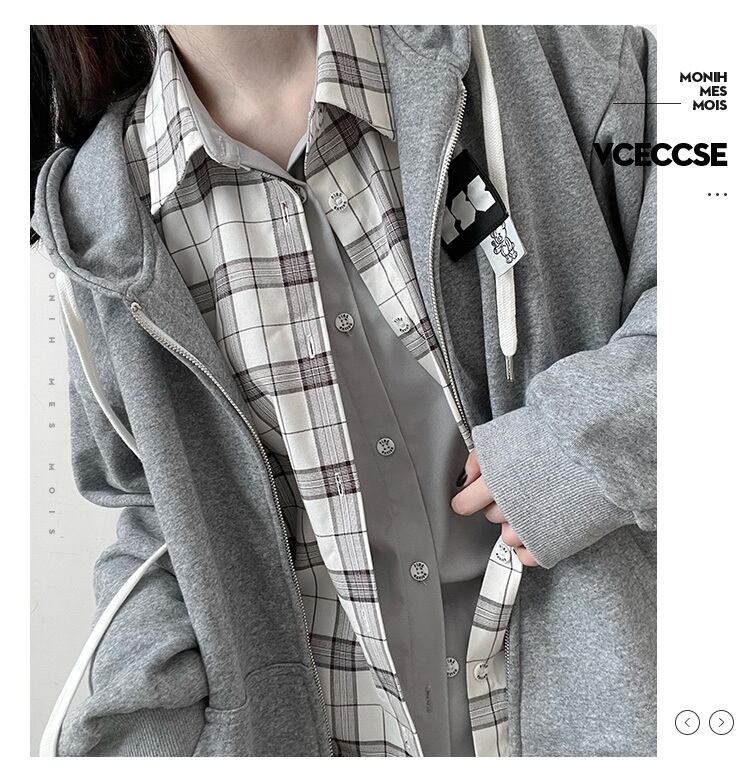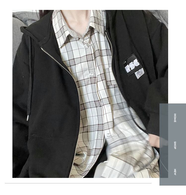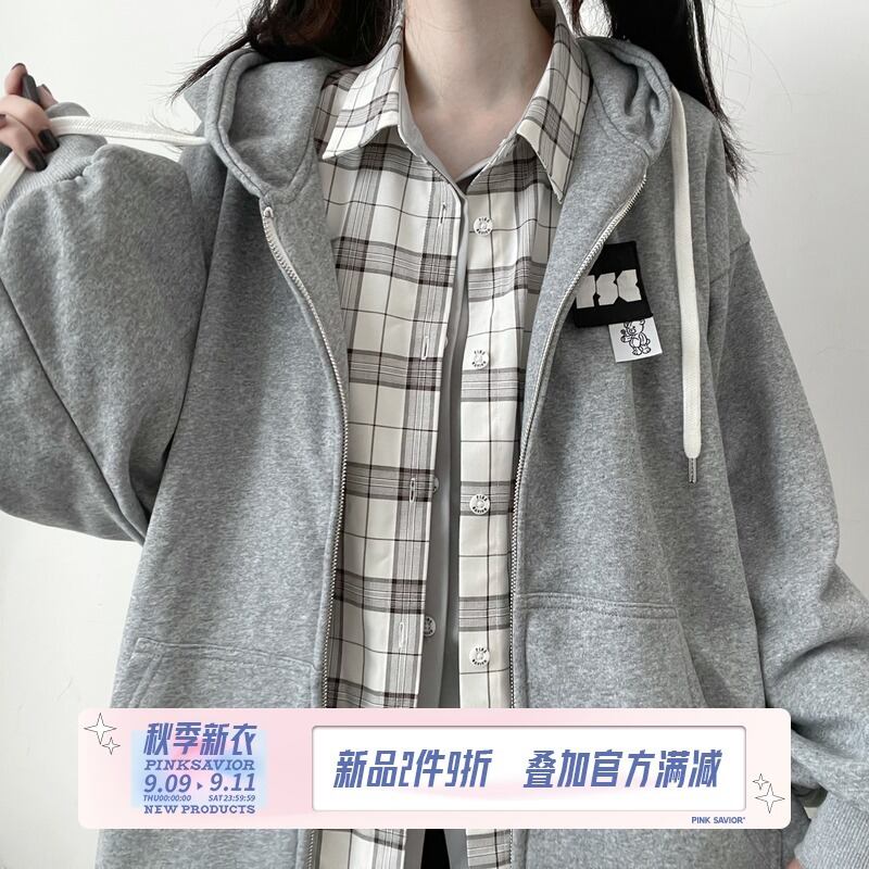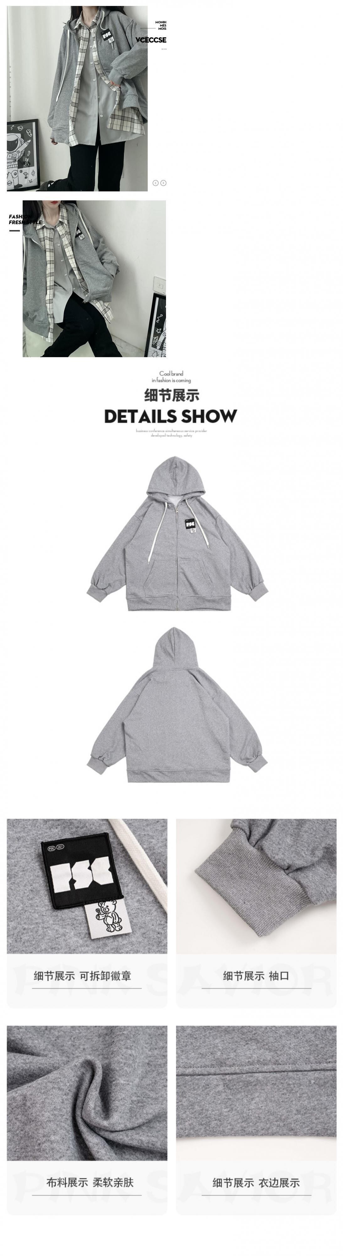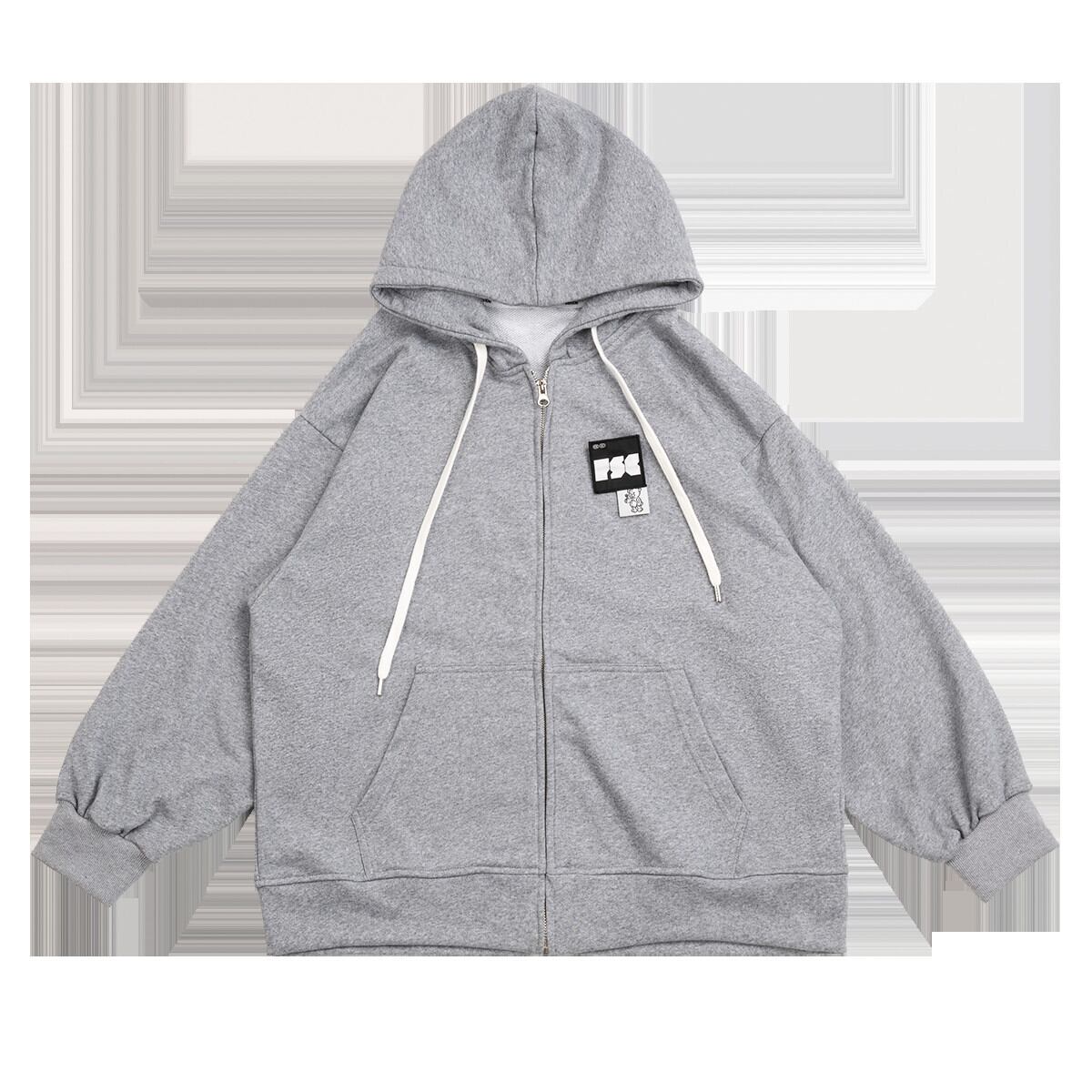 pinksavior黒とグレーのバッジ取り外し可能で積み重ね可能なラッキーベアビッグランタンスリーブジッパーフード付きジャケット ブラック PSTB92531547436