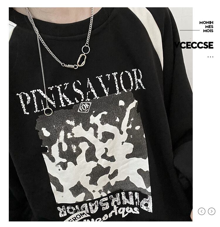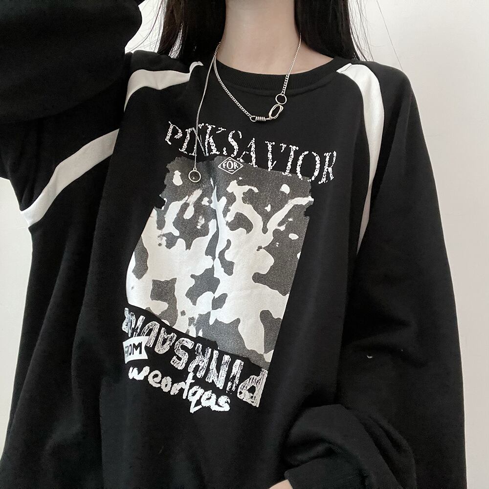 pinksavior黒とグレーのフィルムステッチルーズで薄い秋と冬の長袖ラウンドネックセーター ロング ブラック オータム 秋物 ウィンター 冬物 Oネック PSTB30844942741