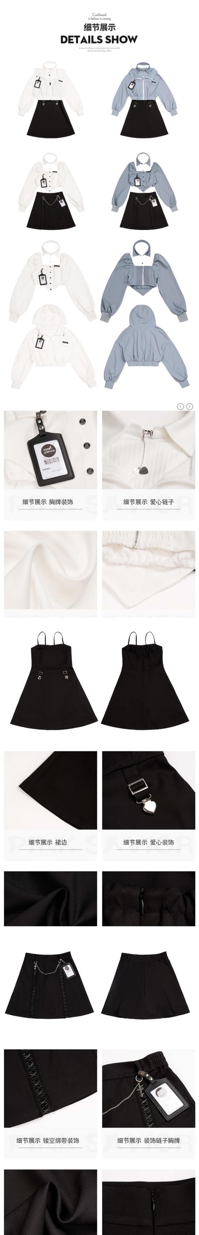 色:ブルーショートフード付きジャケット+襟なしレザーバッジ,ホワイトショートフード付きジャケット+襟なしレザーバッジ,白い三角形の裾のシャツ+襟、革のバッジを送る,青い三角形の裾のシャツ+襟、革のバッジを送る,黒のネクタイスカート,バックルサスペンダースカートが大好き