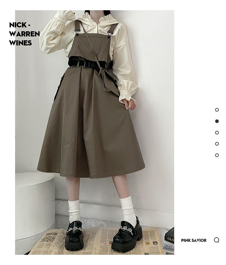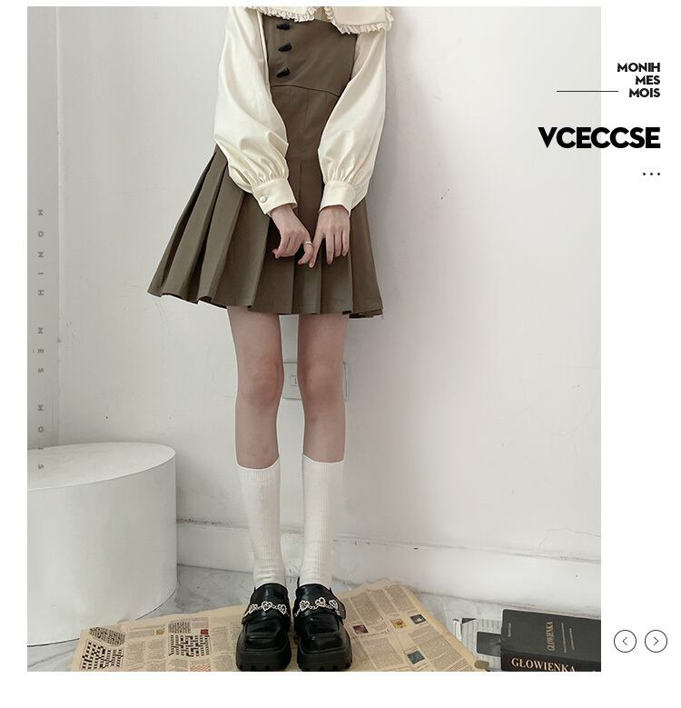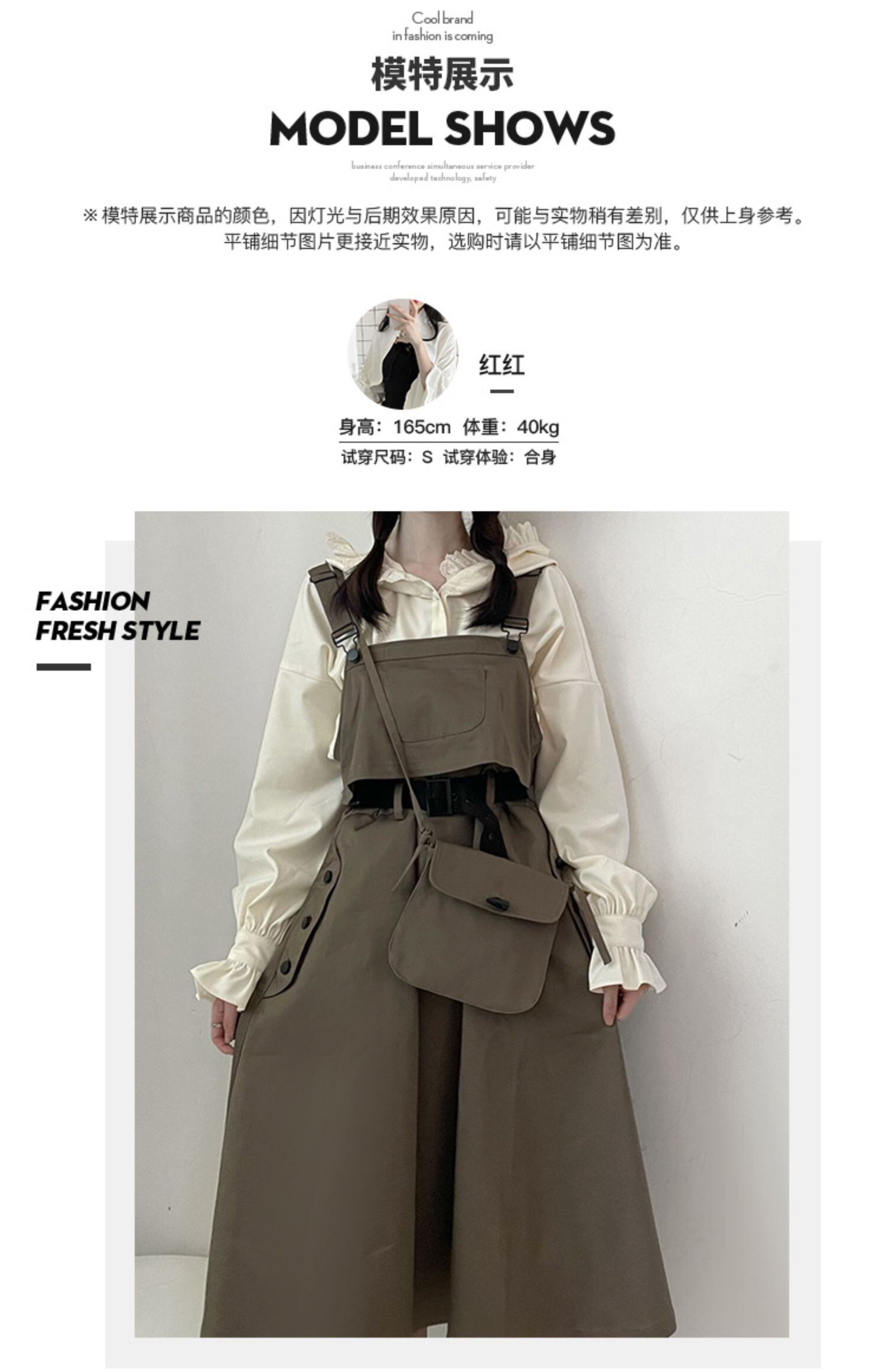 色:スクエアカラーのベージュシャツ,カーキプリーツベストドレス(フリーバッグ),ベージュのフード付きシャツ,カーキロングベストドレス(フリーバッグ)