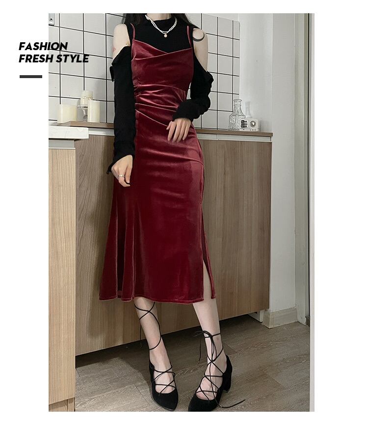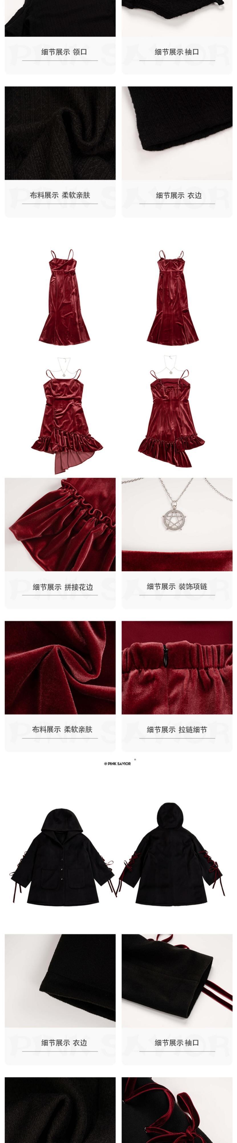 色:内側にストラップレスブラック,ロングスリングベルベットスカート,短い不規則なアリ溝スカート,レースアップブラックウールコート