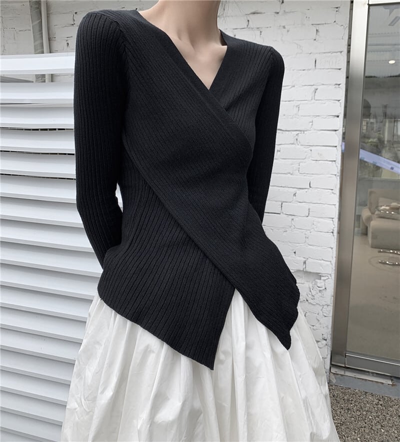黒と白のダークブラックのセーターVネッククロスオーバーデザインセーターは薄くてプルオーバーに見えます ホワイト BWTB47504316440