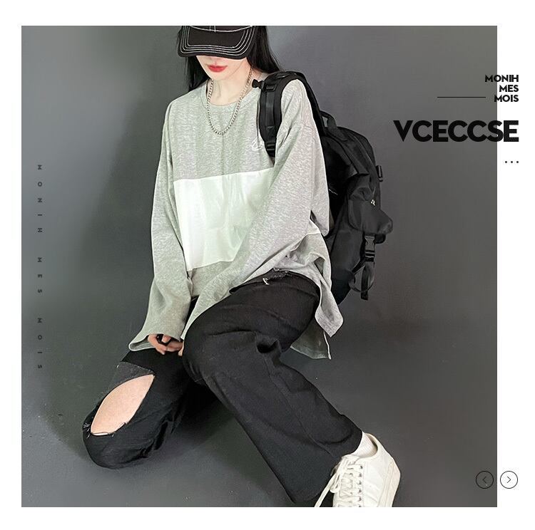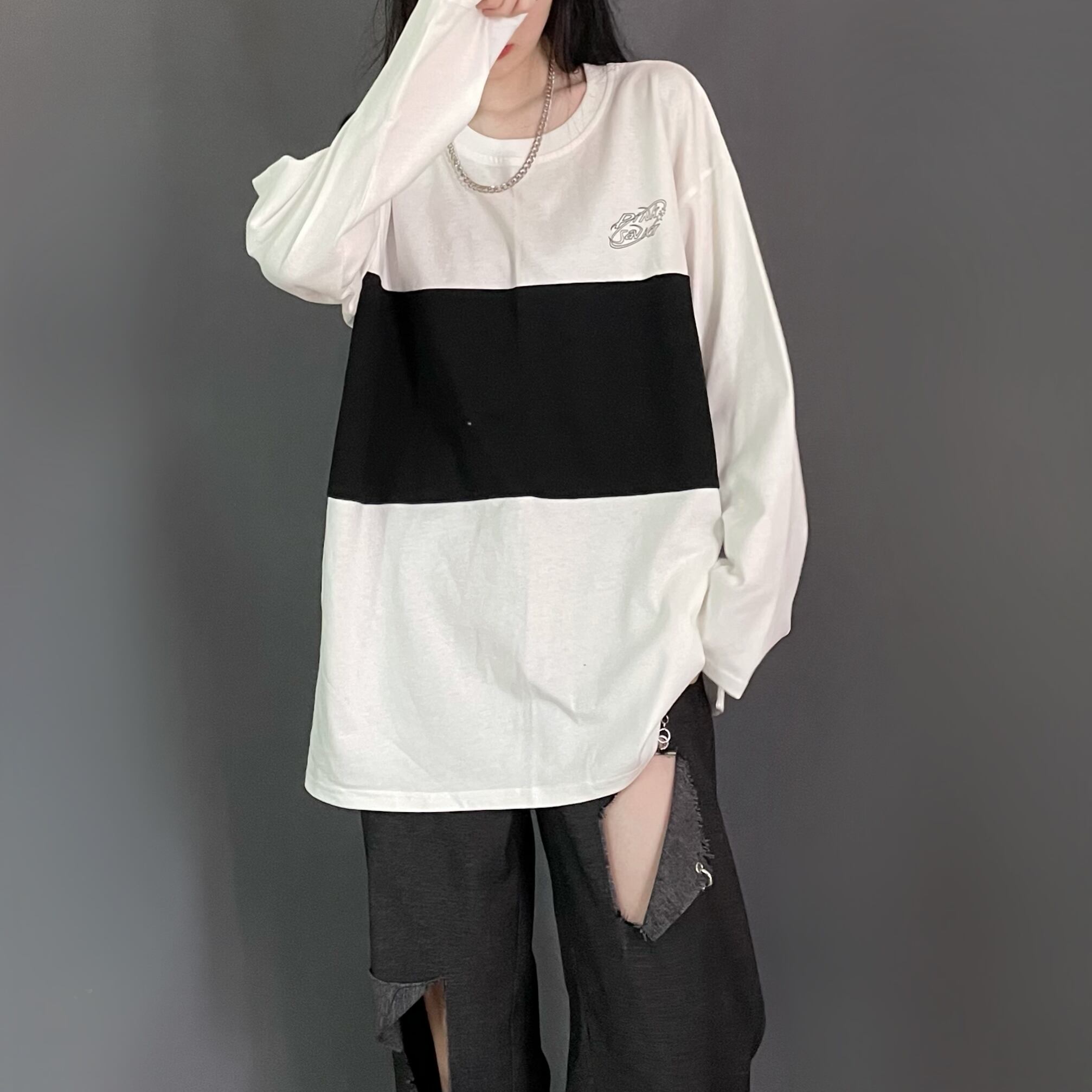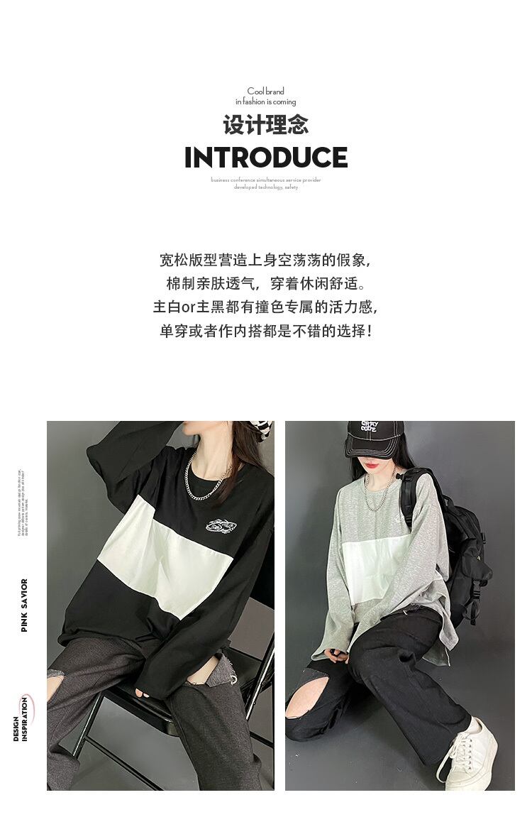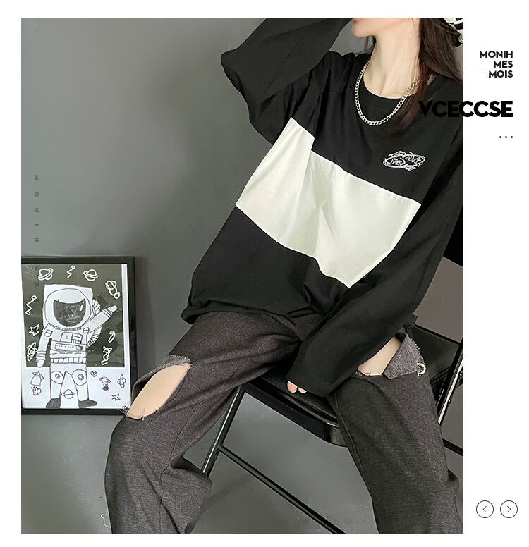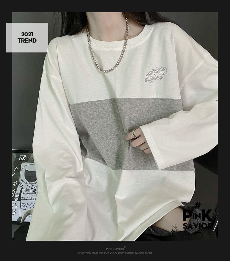 pinksaviorステッチ黒と白の灰色の秋のカジュアルスリムコットン長袖 ロング ホワイト ブラック オータム 秋物 PSTB22725660776