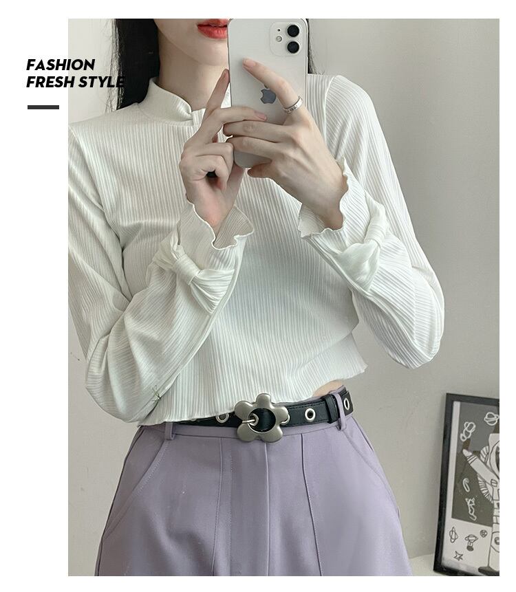 pinksavior黒と白の弓の装飾が秋と冬のハーフハイカラーのストライプ素材の長袖ボトミングシャツを計画 ロング ホワイト ブラック リボン オータム 秋物 ウィンター 冬物 PSTB47661478351