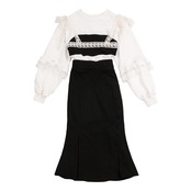 pinksavior [リトルローズ]レースレースデコレーションステッチトップスとフィッシュテールスカートニットスーツ ピンク PSTB21368539551