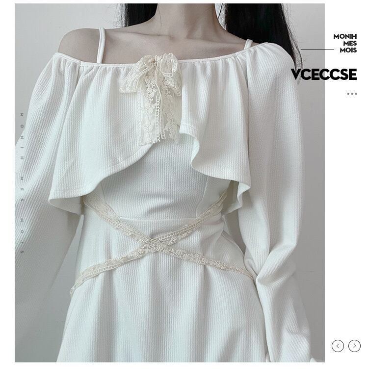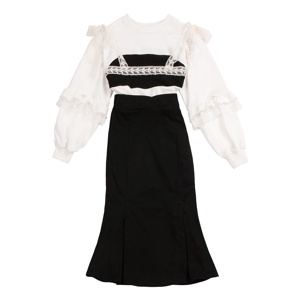 色:ステッチラブペンダントスウェットシャツ,マーメイドスカート,ツーピースの黒のニットレースドレスとショール,ツーピースの白いニットレースのドレスとショール