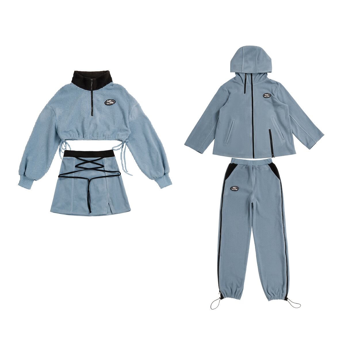 色:内側と外側の青と黒の綿の服,青と黒のジッパージャケット,青と黒のパッチワークパンツ,青と黒のショートトップ,ストラップスカート