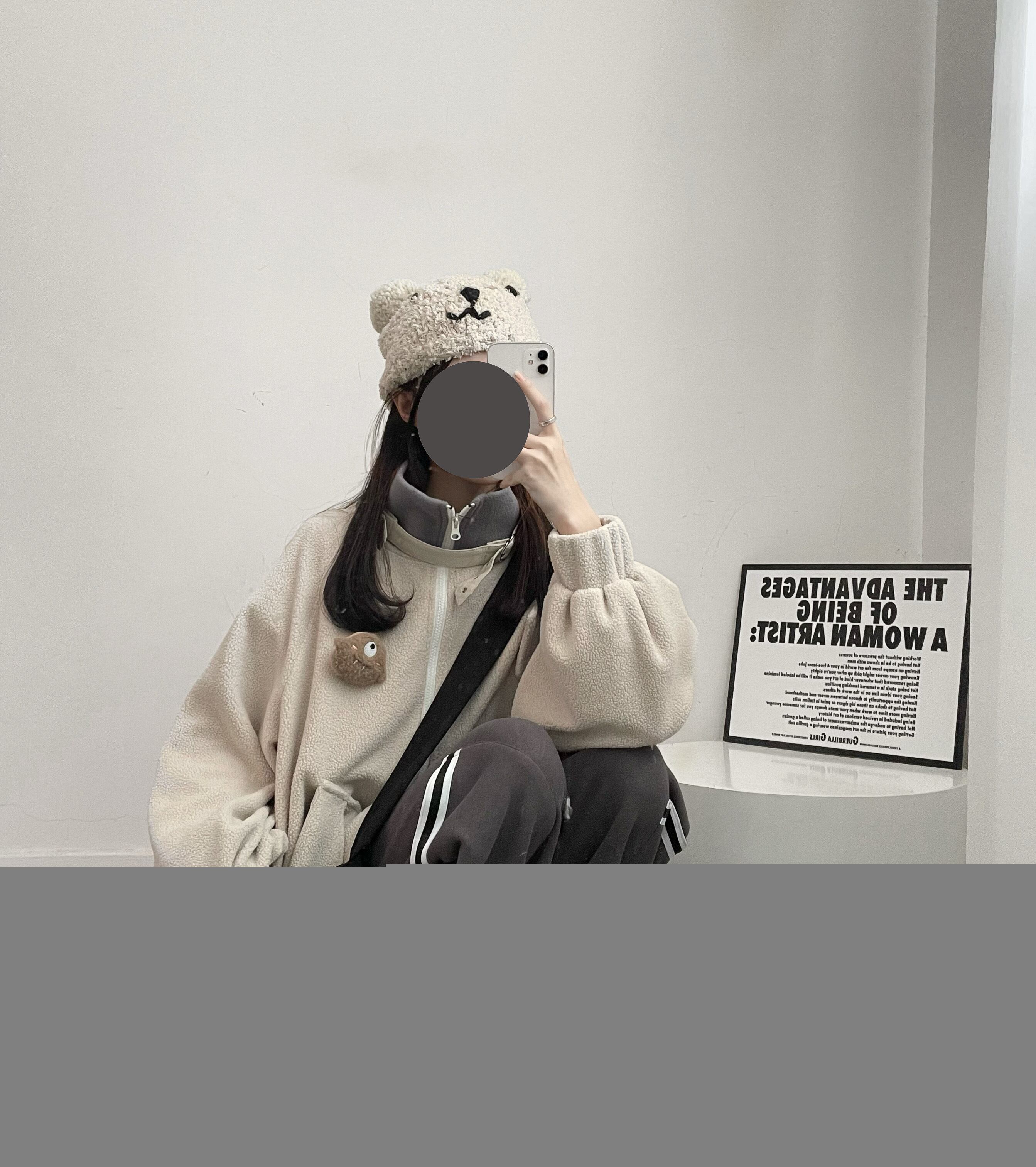 pinksaviorクリームライス&ブラックスウィートリトルモンスターバイクカラー冬ぬいぐるみルーズジッパージャケット 大人ガーリー キュート カジュアル ウィンター 冬物 PSTB52227296289