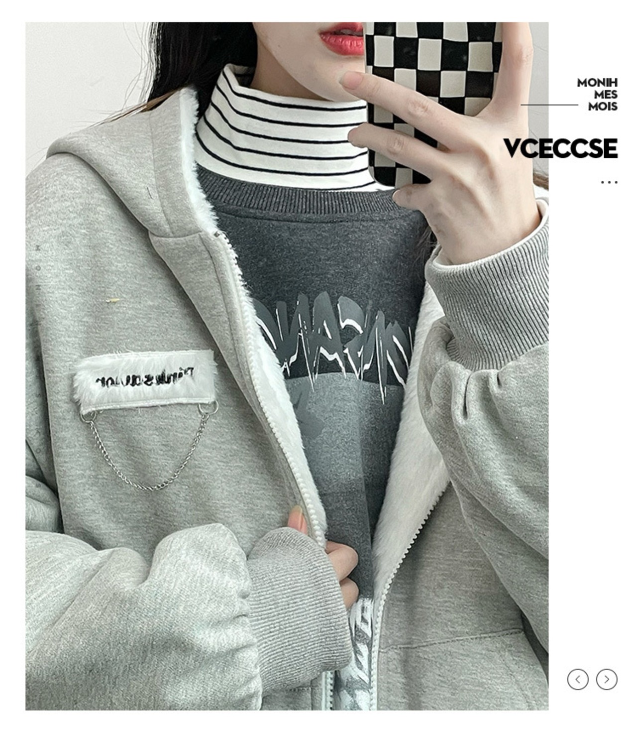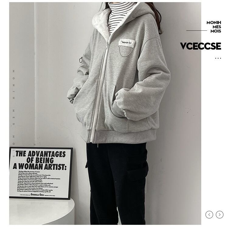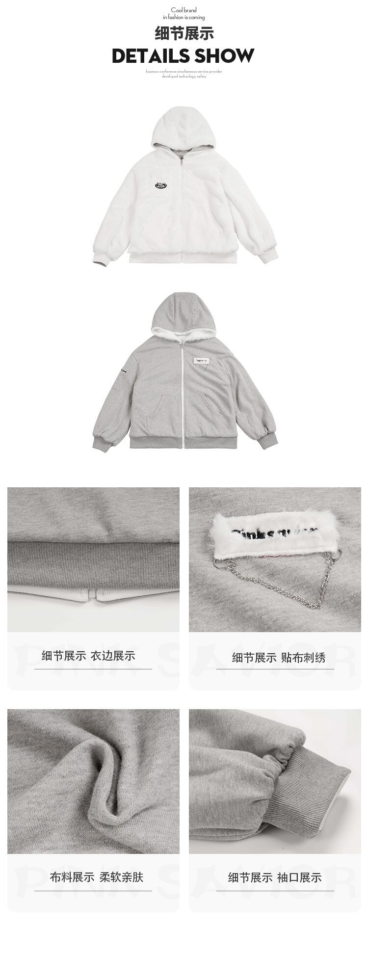 pinksavior厚い両面着用毛皮のような大学ライトグレーフード付き胸飾りジッパーコート PSTB13117564077