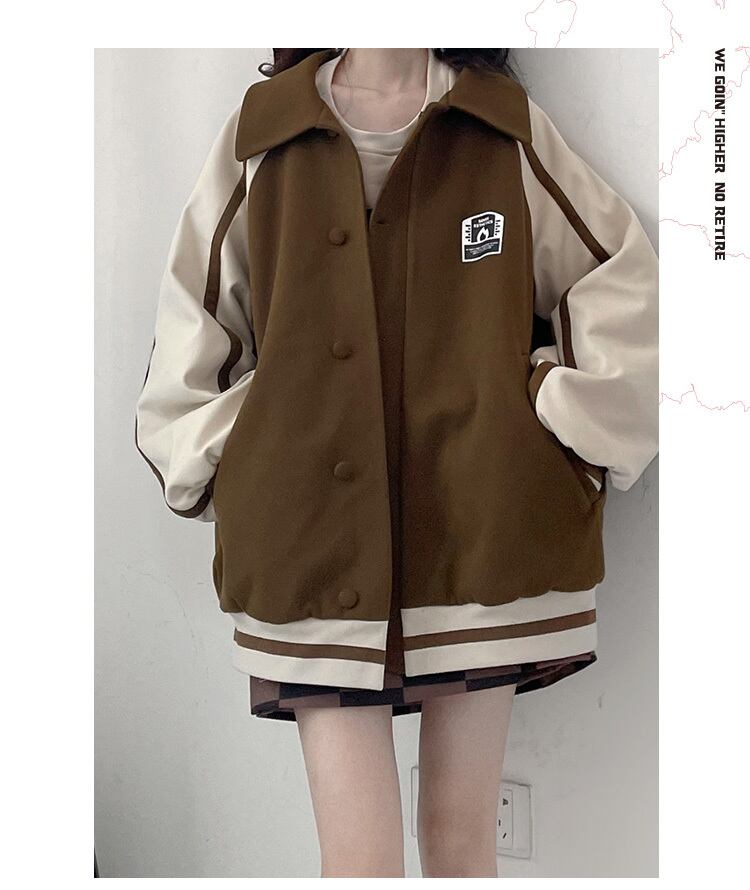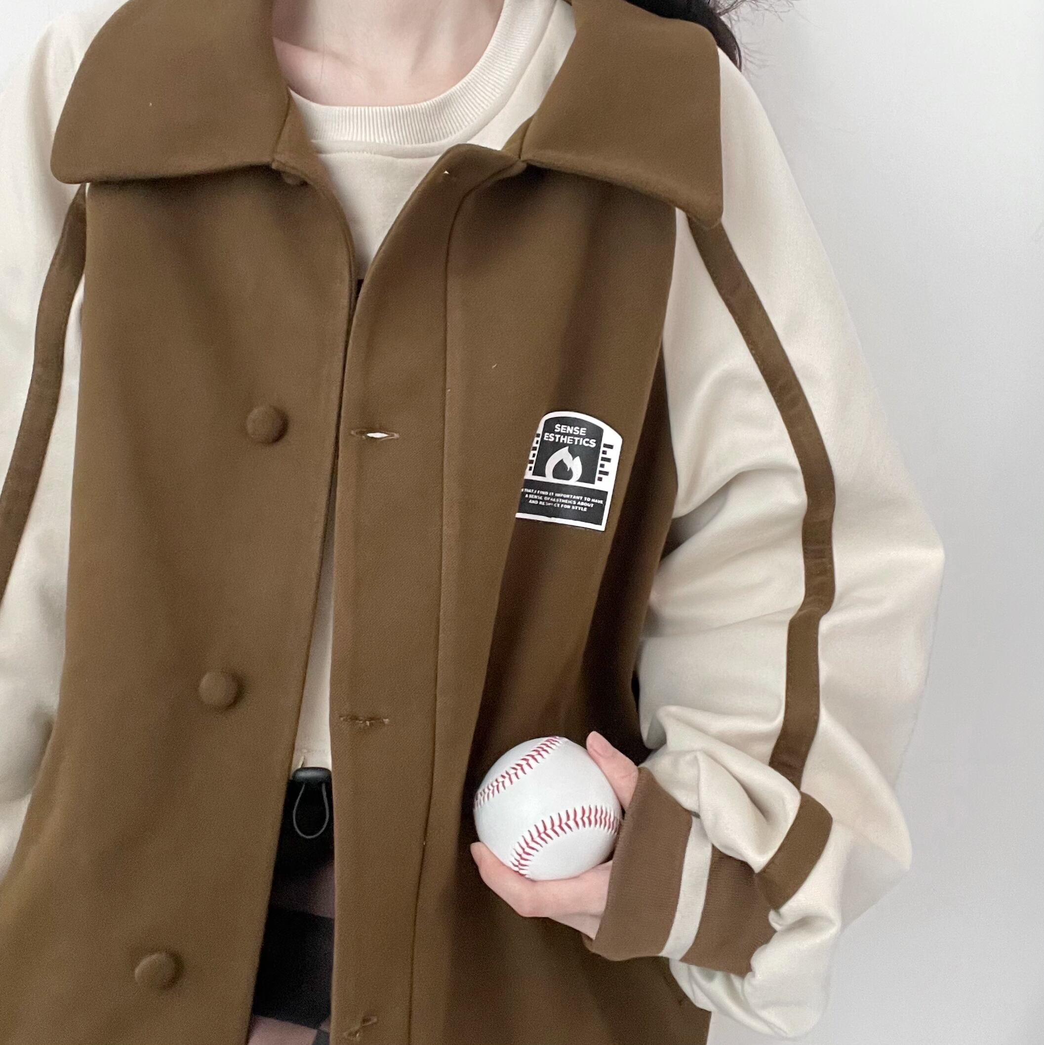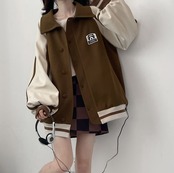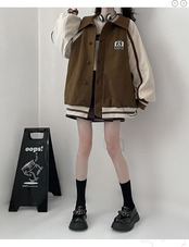 色:短い野球パッド入りジャケット,ロングベースボールパッド入りジャケット,コーヒーカラーモザイクチェック柄ウールスカート,裾にドローストリングのフリーススウェットシャツ