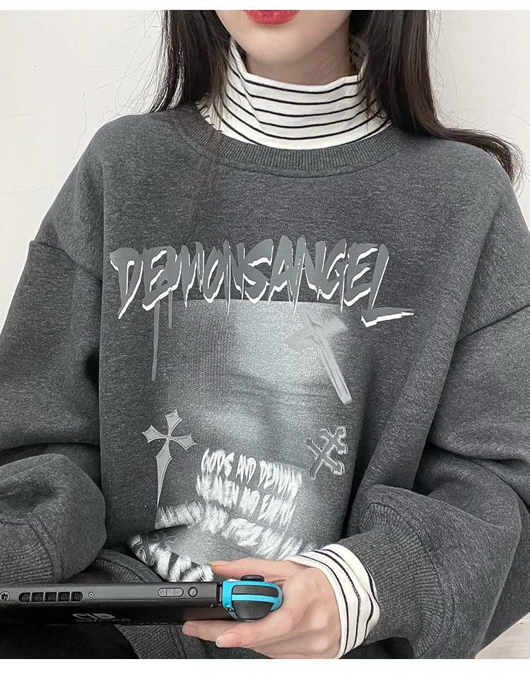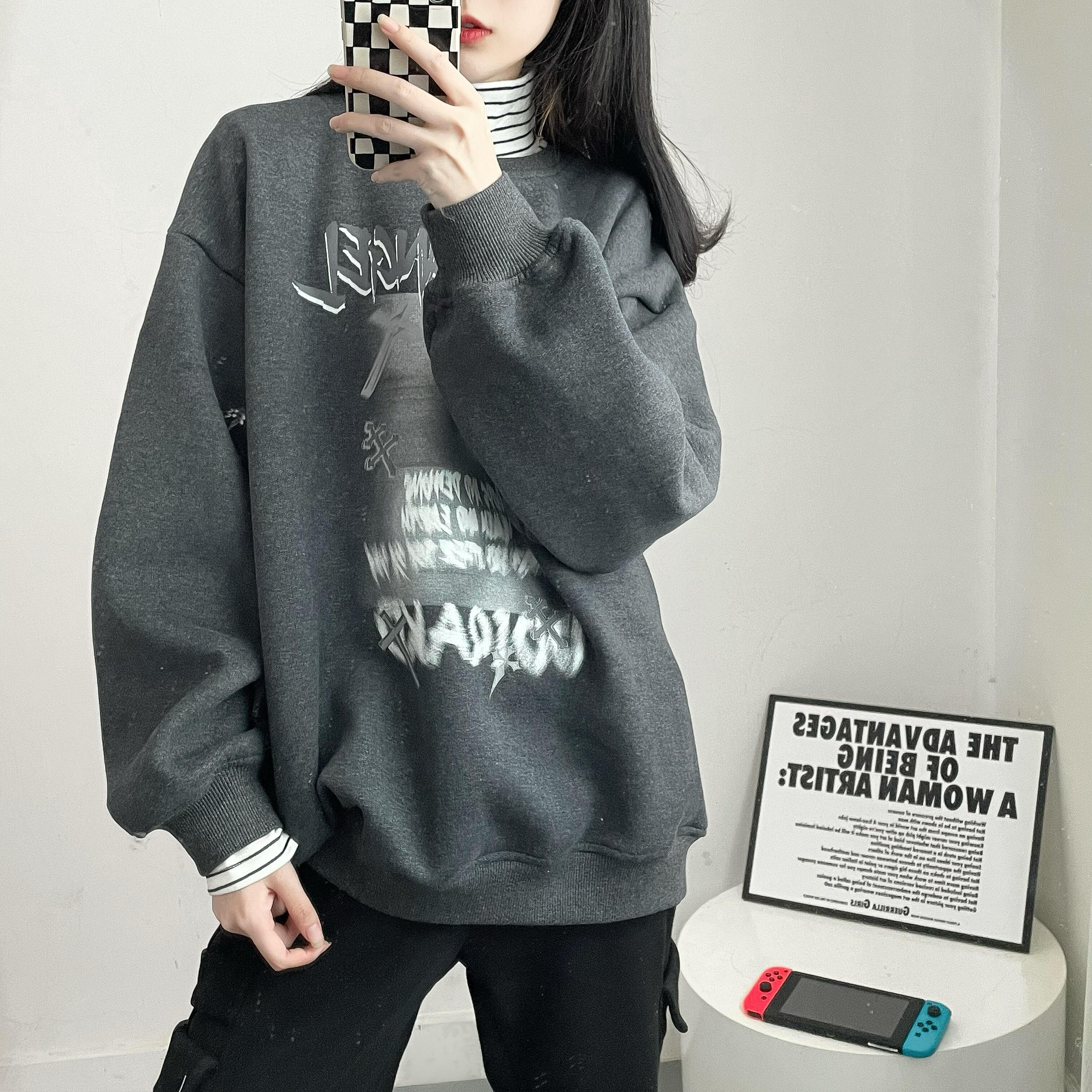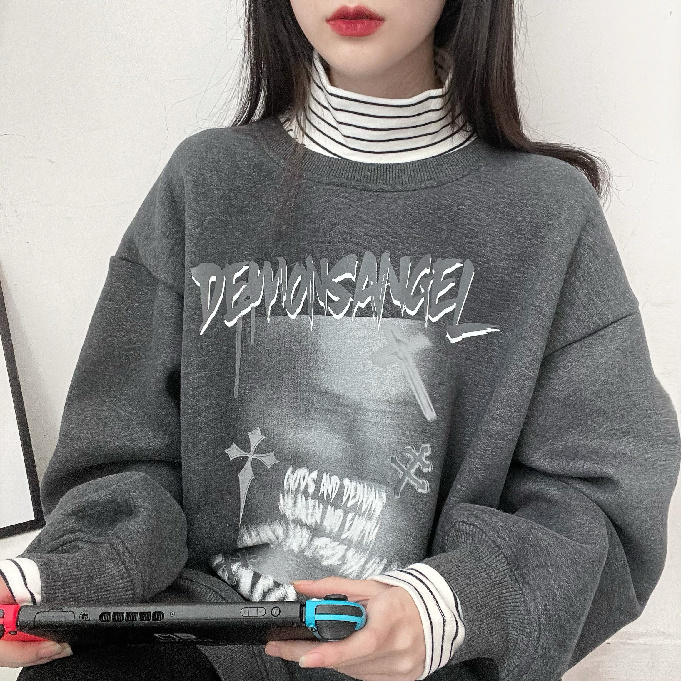 pinksaviorクロスグラフィティプリントダークグレーステッチプラスベルベットウィンターラウンドネック厚手のコットンT 冬物 Oネック PSTB38326669679