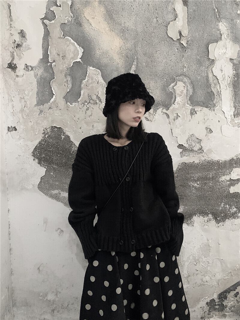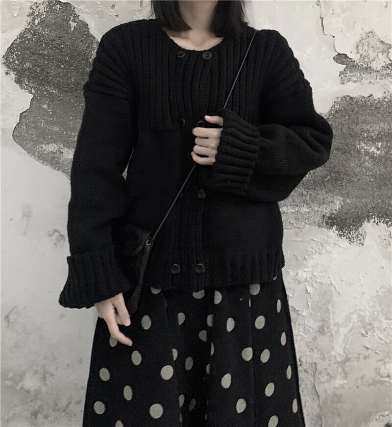黒と白のダークセーター厚手のカーディガンボタンクルーネックワンピース無地長袖シングルブレスト ロング ホワイト ブラック ソリッドカラー BWTB70353386767