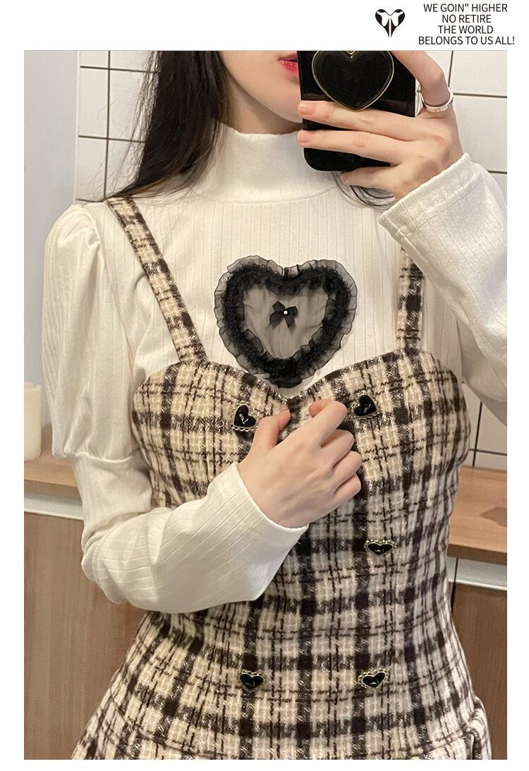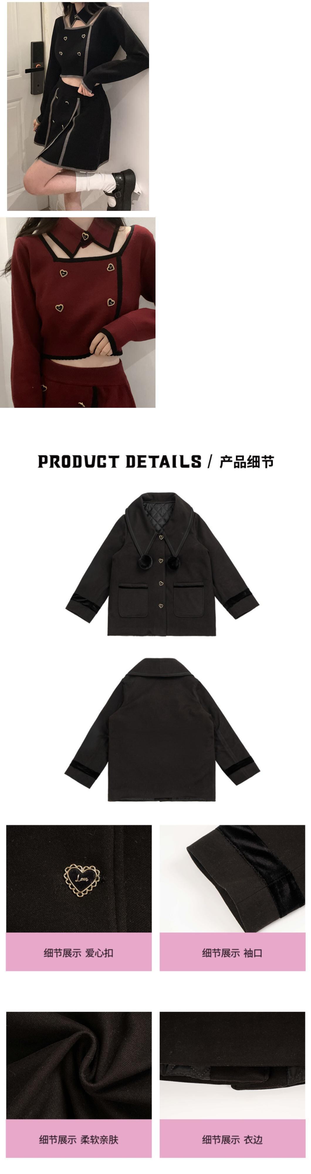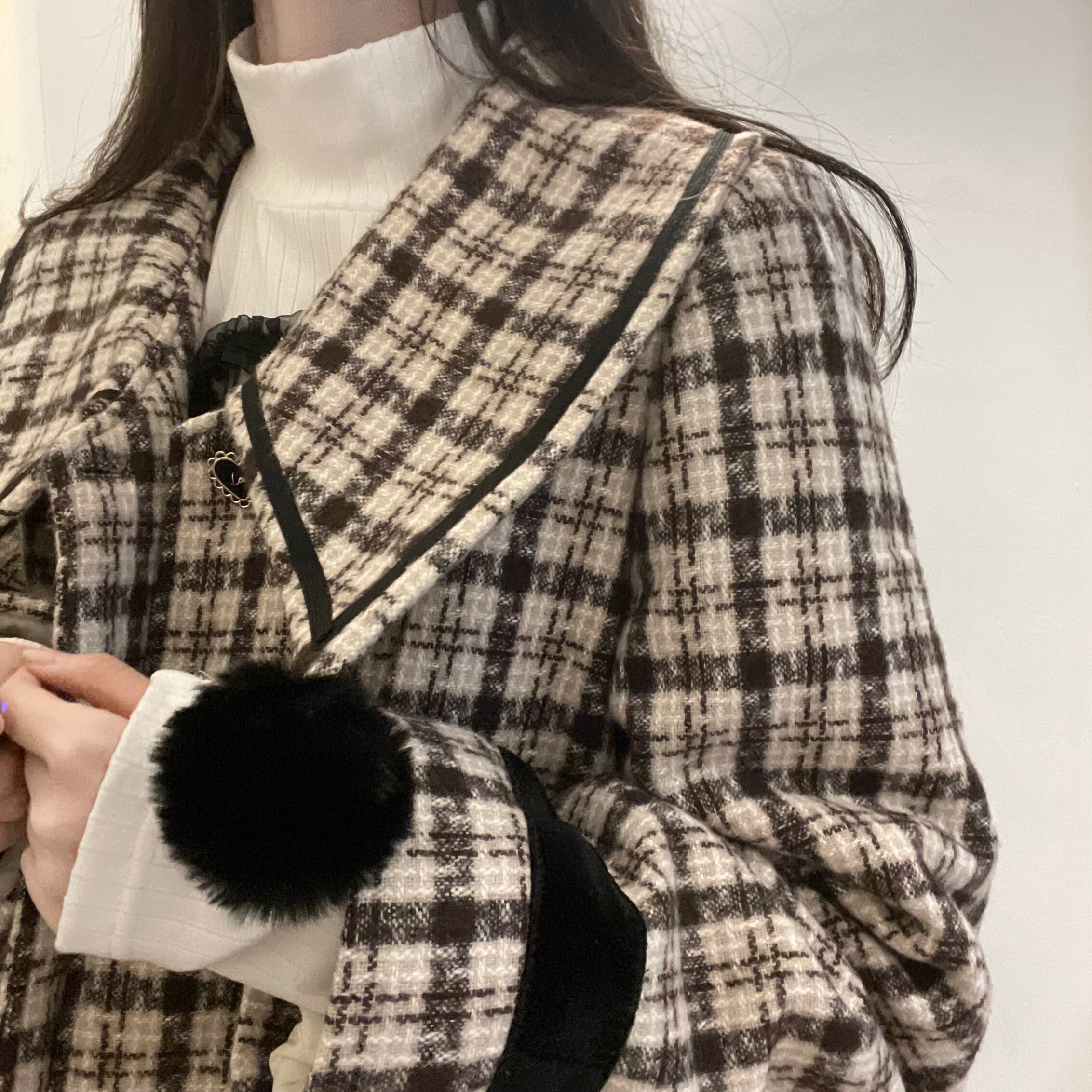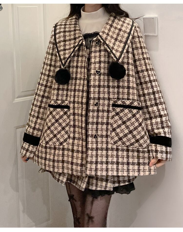 色:黒いジャケット,ブラウンチェック柄スカート,赤いニットトップ+フェイクカラー,赤いニットスカート,黒のニットトップ+フェイクカラー,茶色の格子縞のコート,ラムスリーブボトミングシャツの脚,黒のニットスカート,ブラックストラップドレス