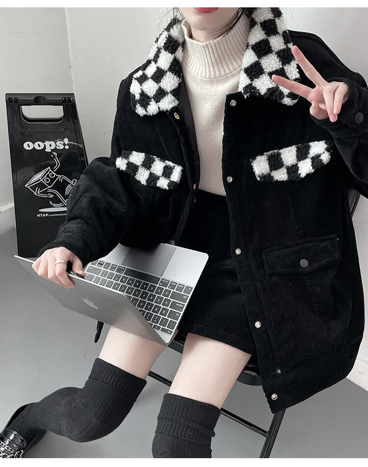 pinksavior格子縞コーデュロイキルティングステッチカレッジポケットルーズコミュータージャケットスカートウィンタースーツ 冬物 PSTB75499020342