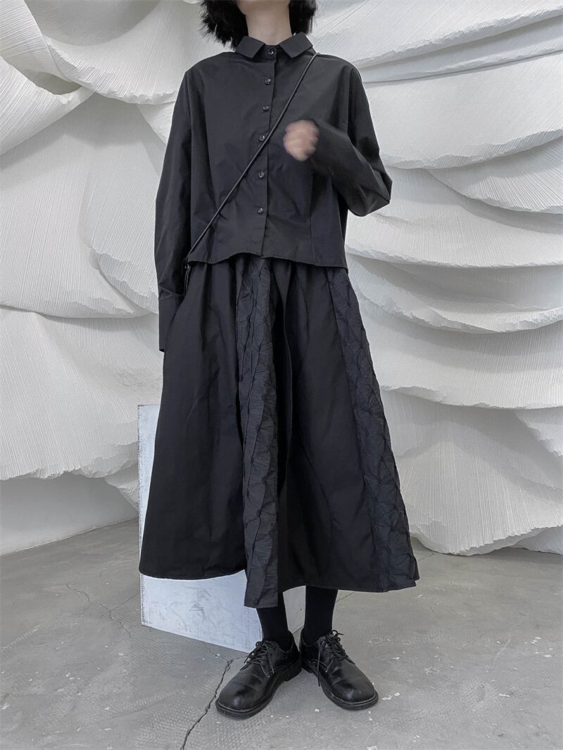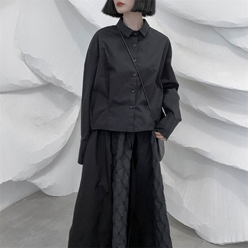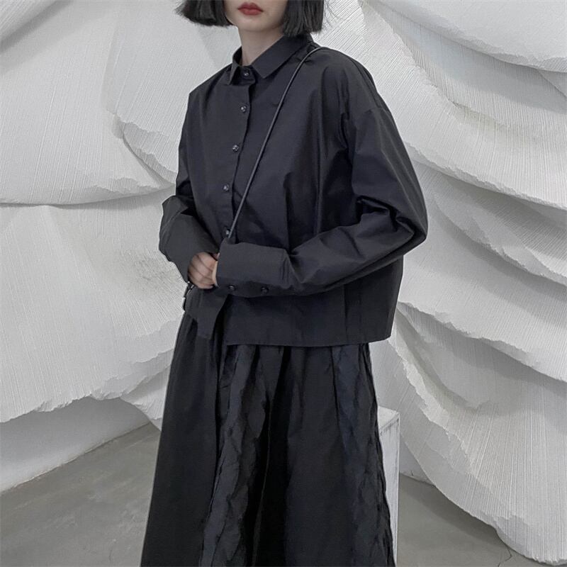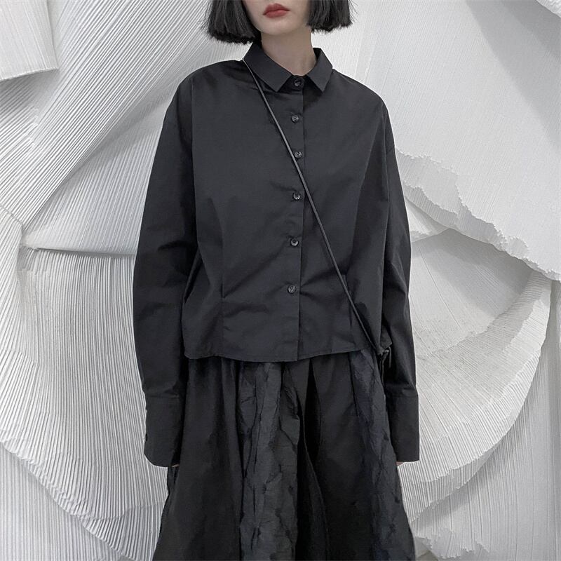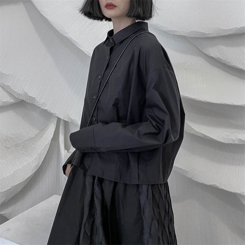 BLANK ANDWHITEダークブラックピンチプリーツシャツレディース春ショート無地コットンルーズシャツ ホワイト スプリング 春物 ソリッドカラー BWTB95087904654
