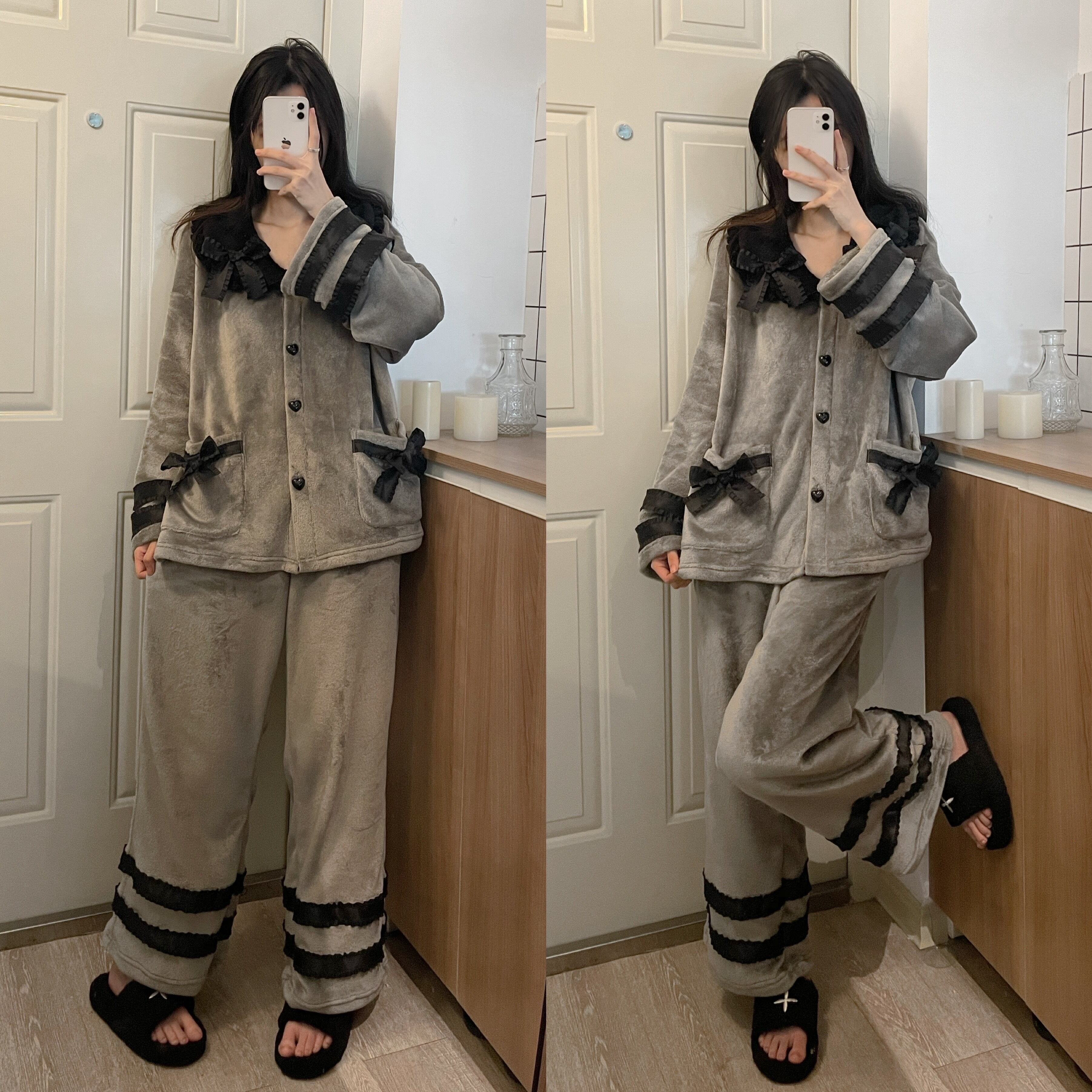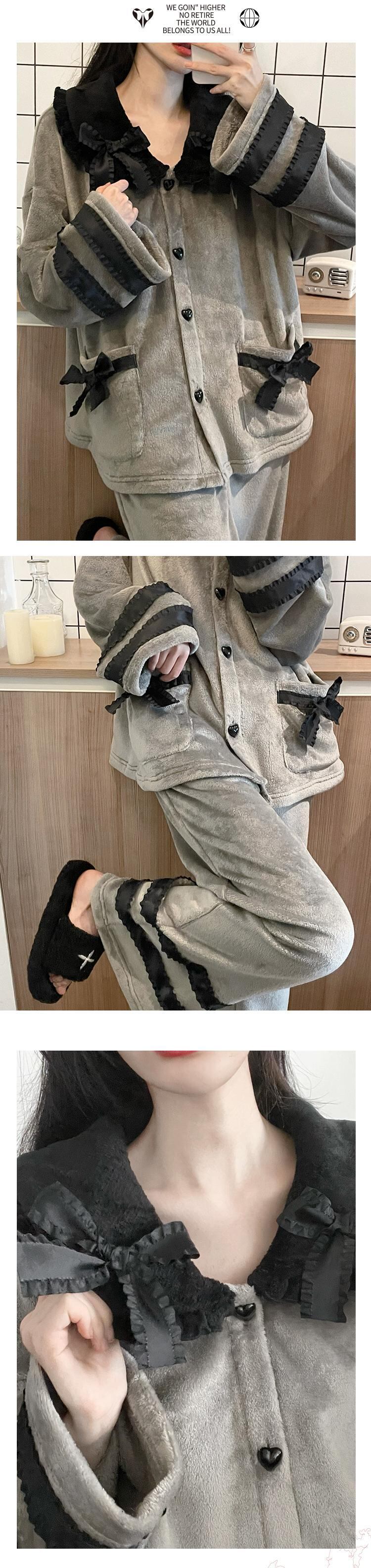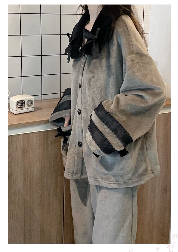 pinksavior冬のロマンチックな灰色の黒い柔らかいレースの装飾冬のフランネルの女性の家庭服 ブラック ウィンター 冬物 PSTB42037707778
