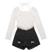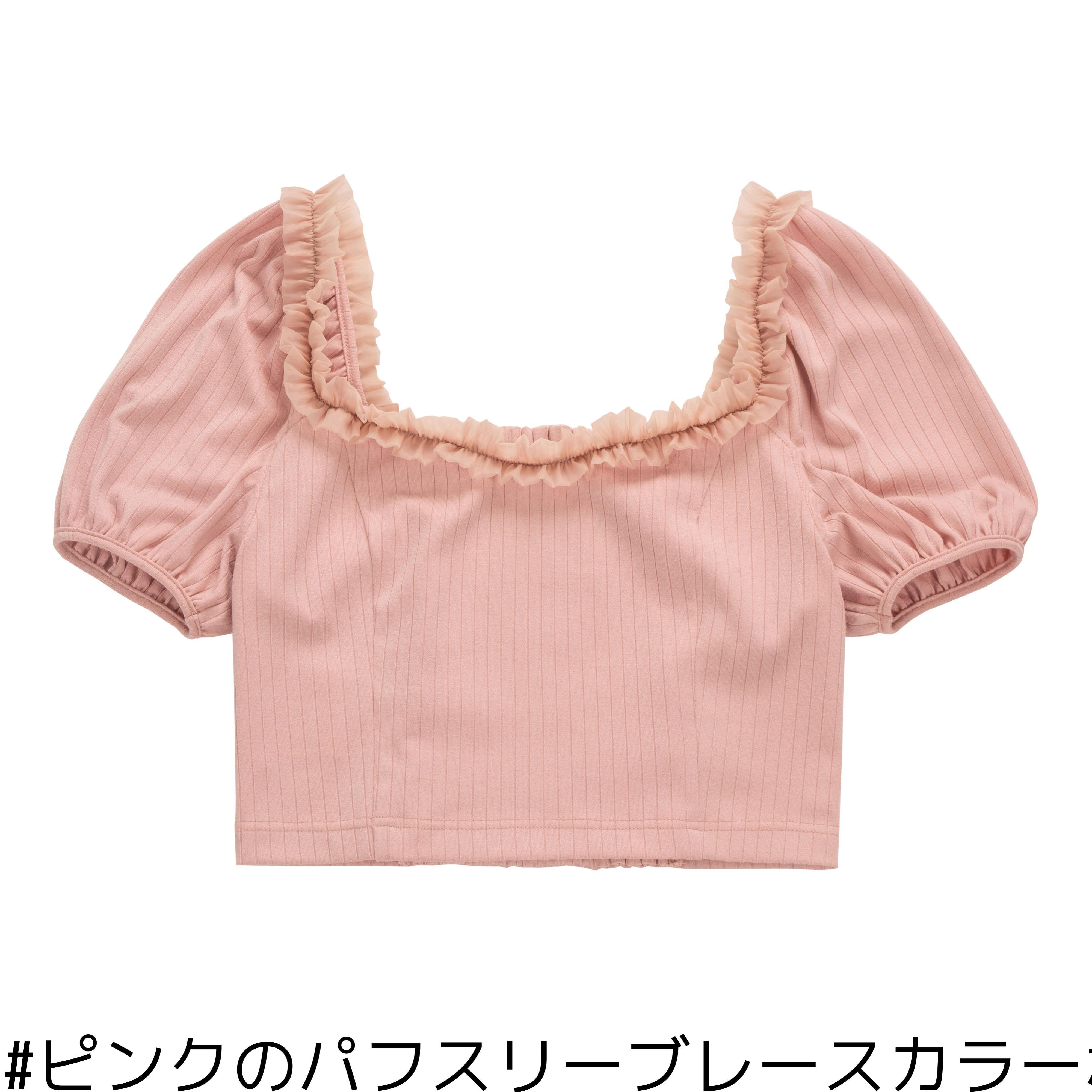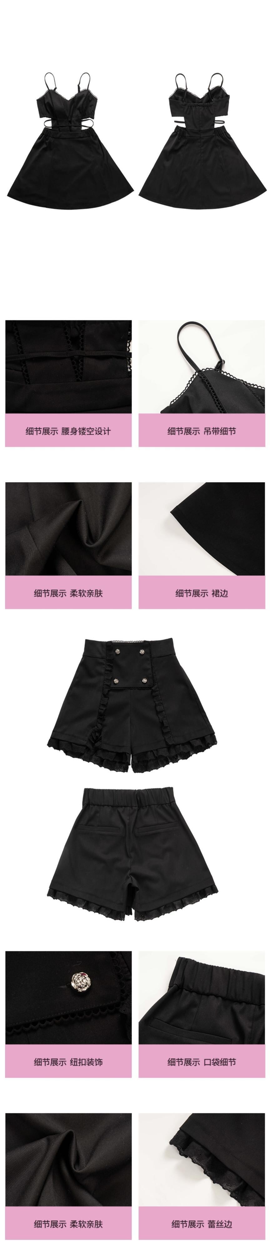 色:ピンクネクタイ長袖ボトムシャツ,ブラックウエストカットアウトドレス,ピンクのパフスリーブレースカラーボトミングシャツ,ブラックレース裏地付きショーツ,ホワイトホルターネックトライアングル裾ボトミングシャツ,黒のレースアップスカート,白い胸の中空ボトミングシャツ,黒のレースショーツ