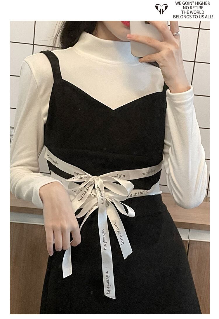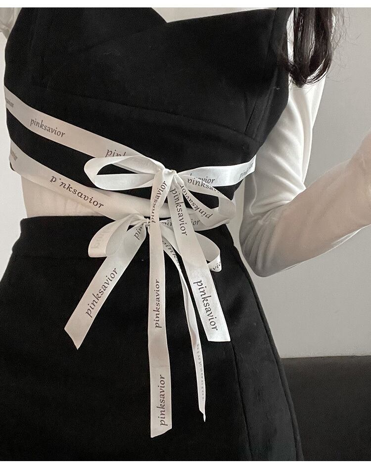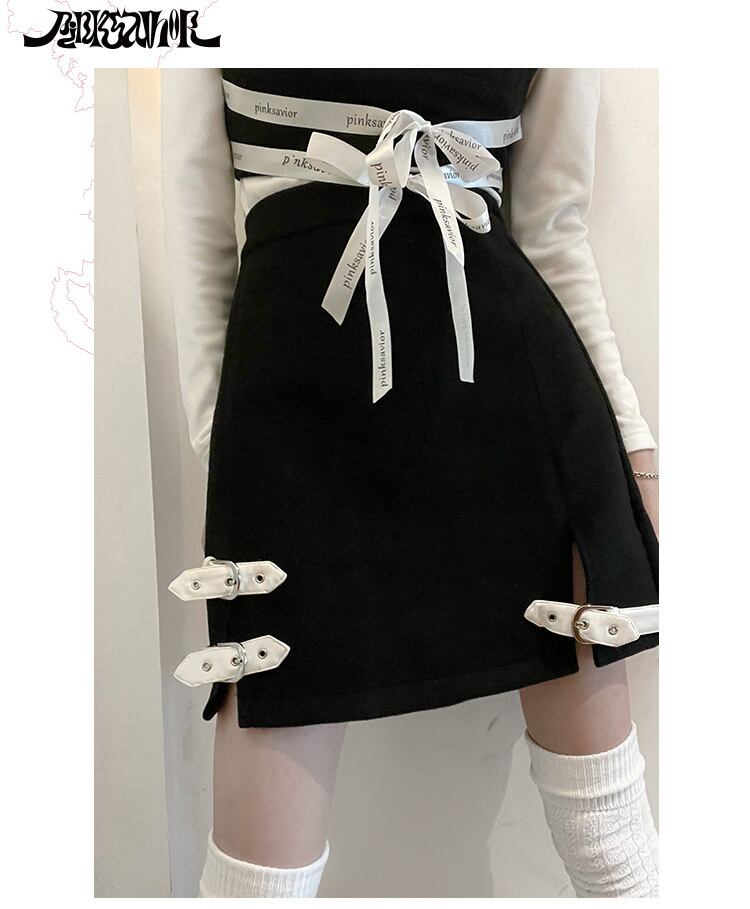 サスペンダーウールスカート冬で飾られたpinksavior黒と白の対照的なリボン ホワイト ブラック ウィンター 冬物 PSTB5480992532