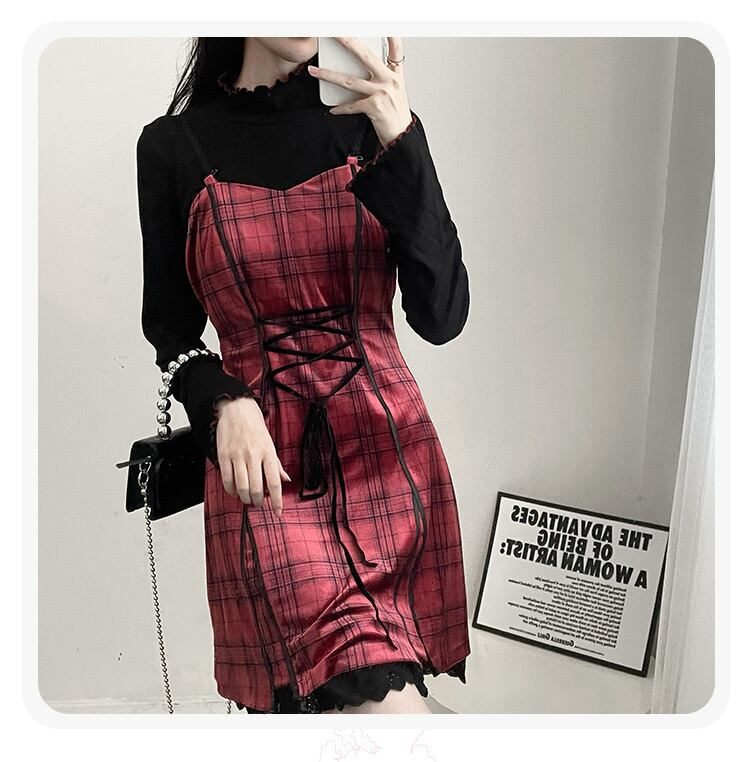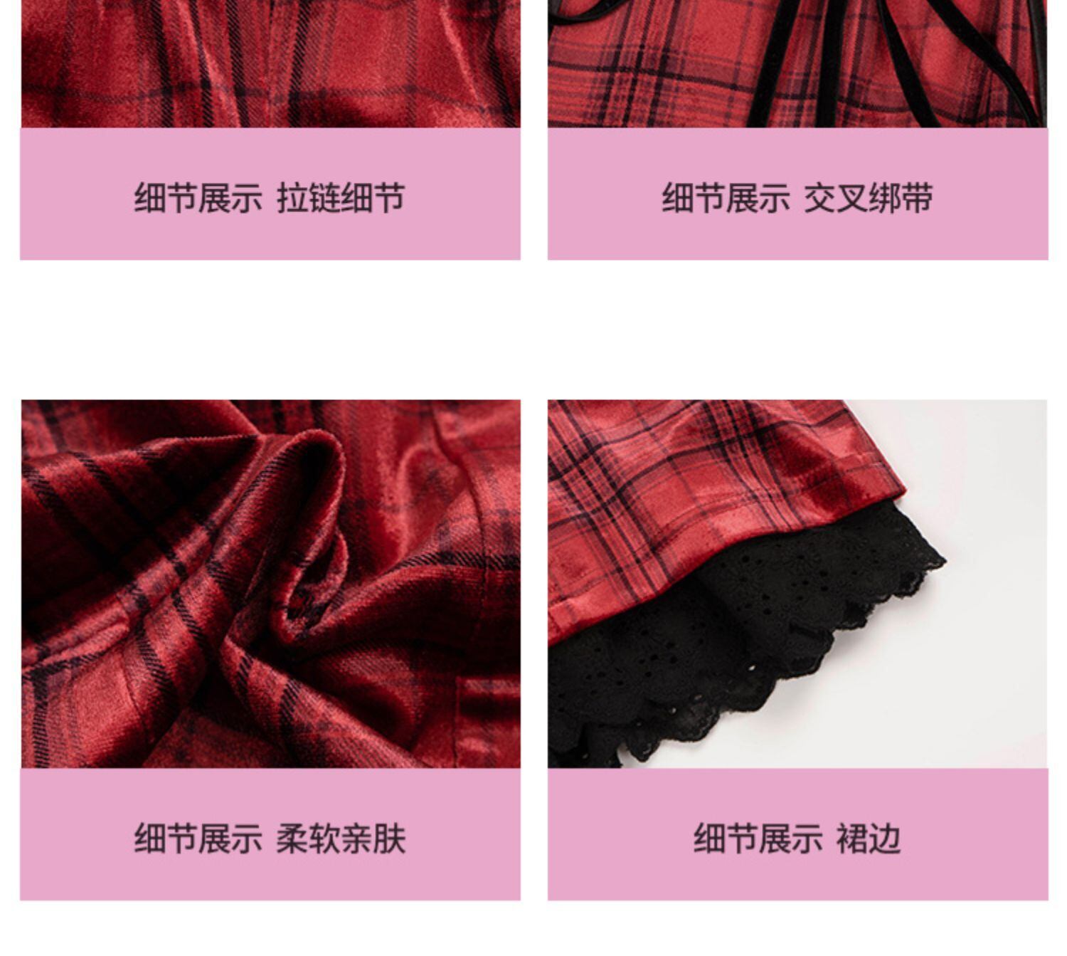pinksaviorはエレガントで高級感のある赤いチェック柄のベルベットスリムフィットストラップスリムドレス ピンク レッド PSTB41074815300
