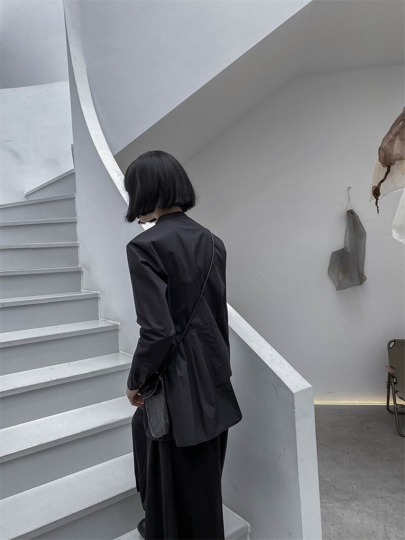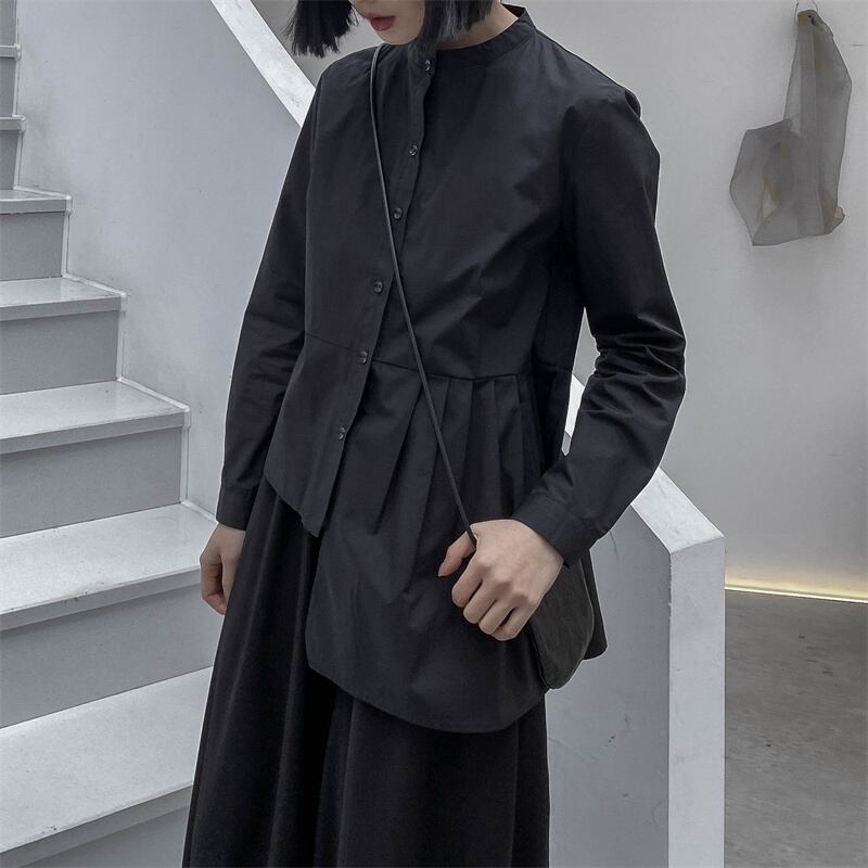 BLANK ANDWHITEダークオリジナルデザイン長袖シャツレディース春プリーツスタンドカラー無地シャツ ロング ホワイト スプリング 春物 ソリッドカラー BWTB62520501794