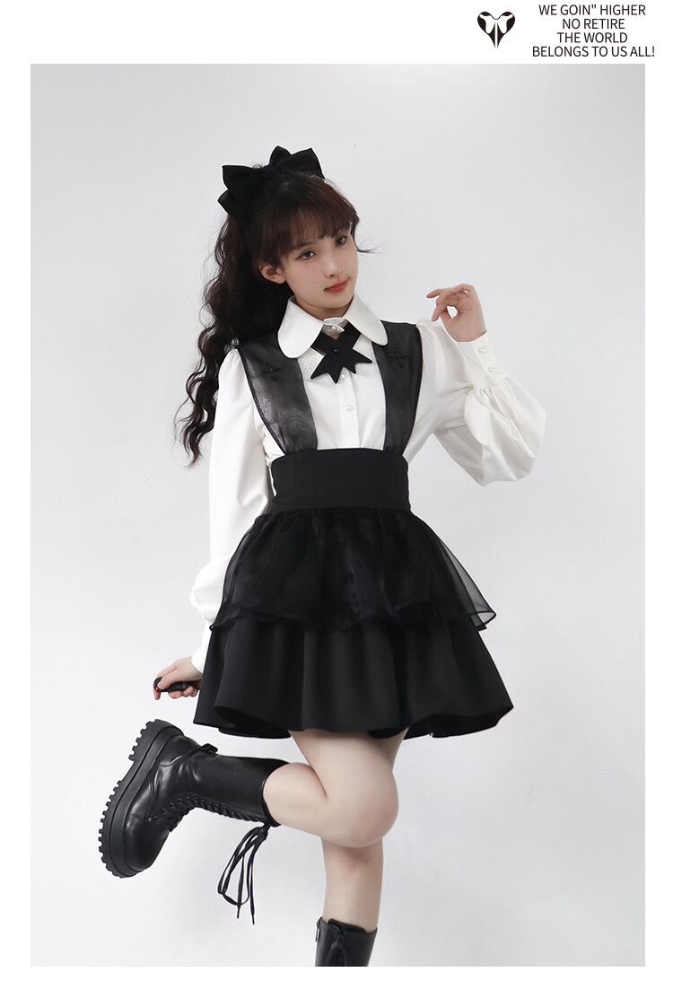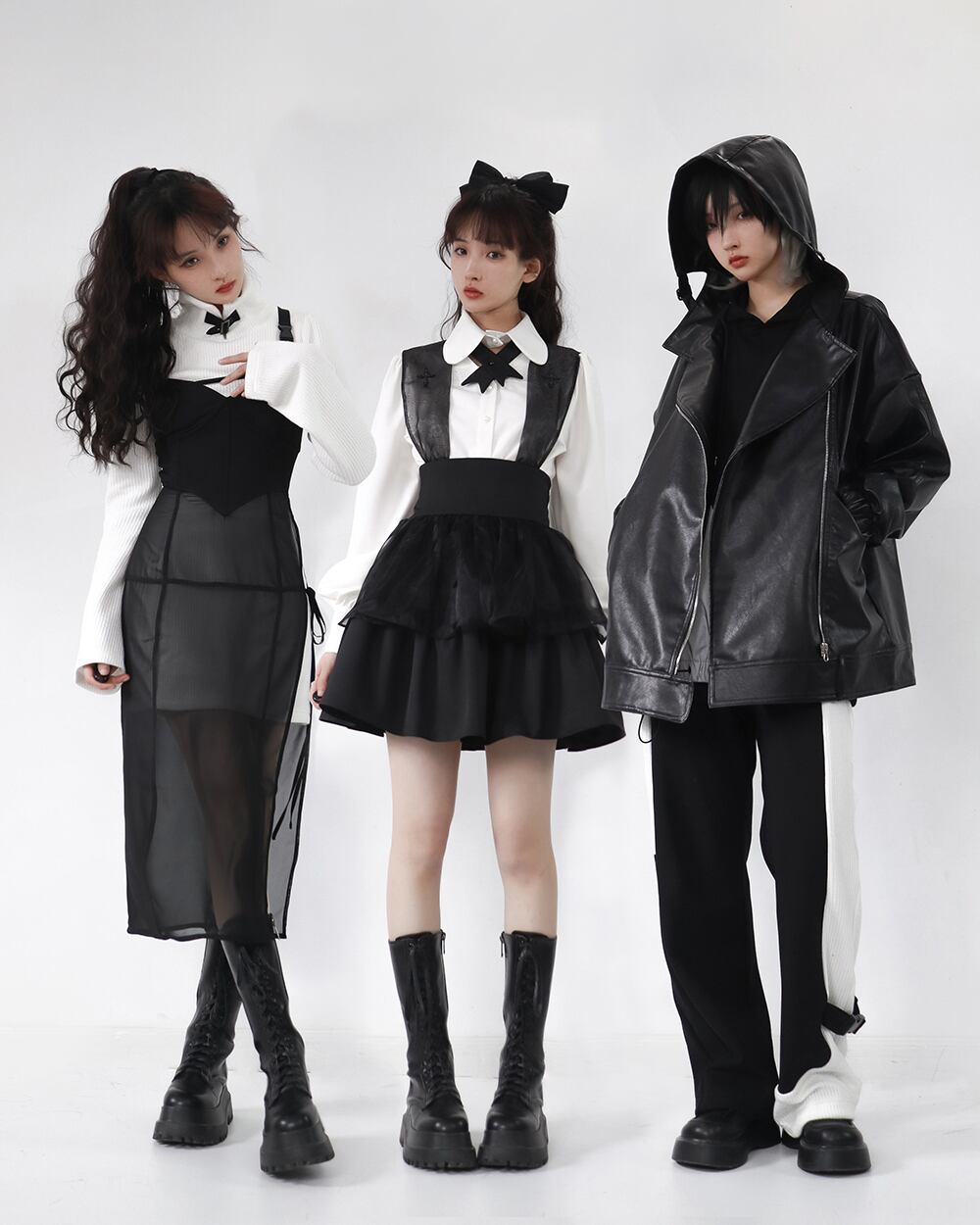 色:フード付きPUジャケット,不規則なセーター,ロングウエストガーゼスリップドレス,シャツ,レイヤードサスペンダースカート,黒と白のパネルパンツ,薄いセータードレス