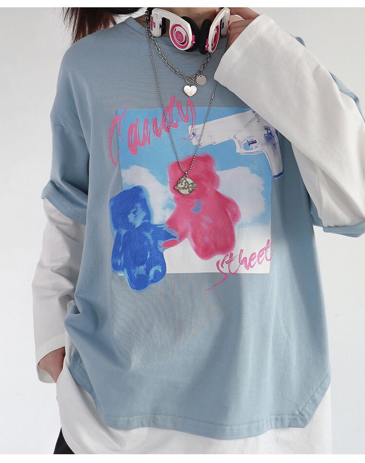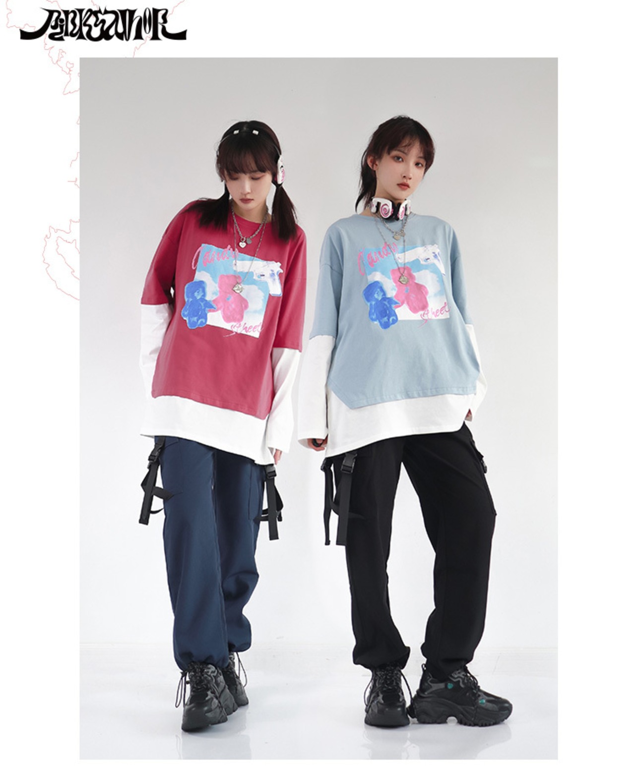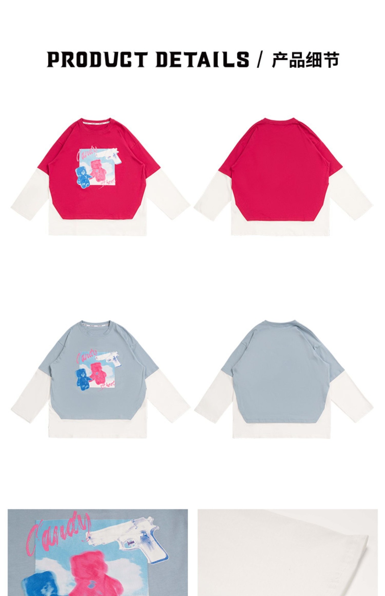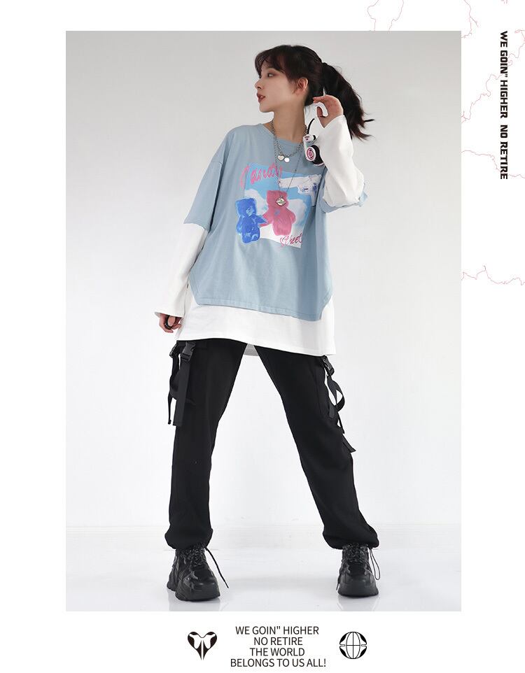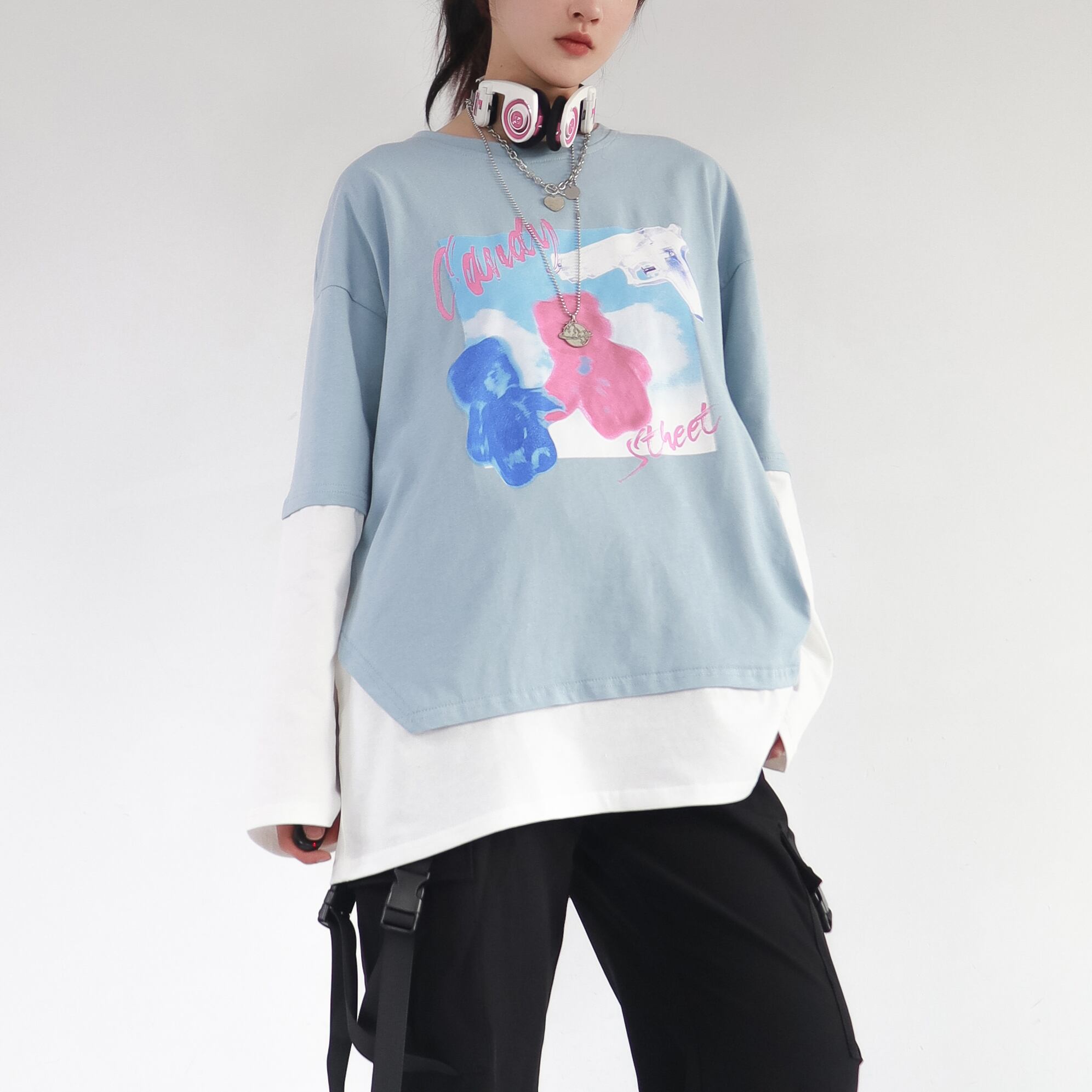 pinksaviorグミベア2022年春のトップフェイクツーピース長袖Tシャツレディースラウンドネックコットンボトミングシャツ ロング スプリング 春物 Oネック PSTB63075959039